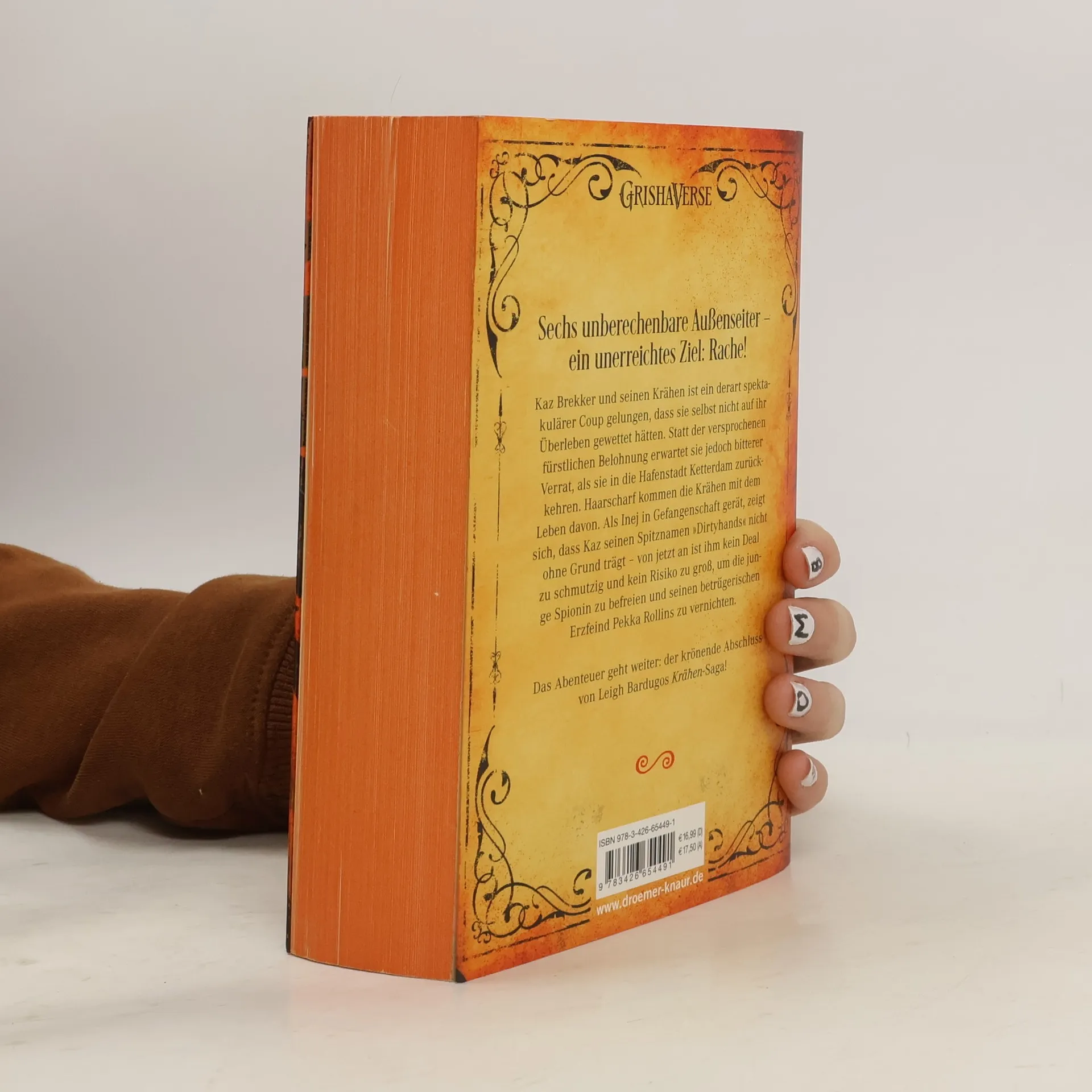 Sechs unberechenbare Außenseiter verfolgen ein unerreichbares Ziel: Rache! Das Abenteuer geht weiter mit einem Dieb, der die unwahrscheinlichsten Auswege findet, einer geheimnisvollen Spionin, einem verurteilten Rachesuchenden, einer Magierin, die ihre Kräfte im Slum einsetzt, einem risikofreudigen Scharfschützen und einem Ausreißer mit Talent für Sprengstoff. Kaz Brekker und seine Krähen haben einen spektakulären Coup gelandet, den sie selbst nicht für möglich gehalten hätten. Doch anstelle der versprochenen Belohnung erwartet sie bitterer Verrat bei ihrer Rückkehr nach Ketterdam. Nur mit knapper Not entkommen sie dem Tod, doch Kaz' Geliebte Inej wird gefangen genommen. Kaz, bekannt als "Dirtyhands", ist bereit, alles zu riskieren, um Inej zu befreien und seinen betrügerischen Erzfeind Pekka Rollins zu vernichten. Das packende Finale dieser Fantasy-Geschichte verspricht Nervenkitzel und unvorhersehbare Wendungen, während die Krähen alles auf eine Karte setzen, um ihre Ziele zu erreichen und sich den Herausforderungen zu stellen, die vor ihnen liegen.