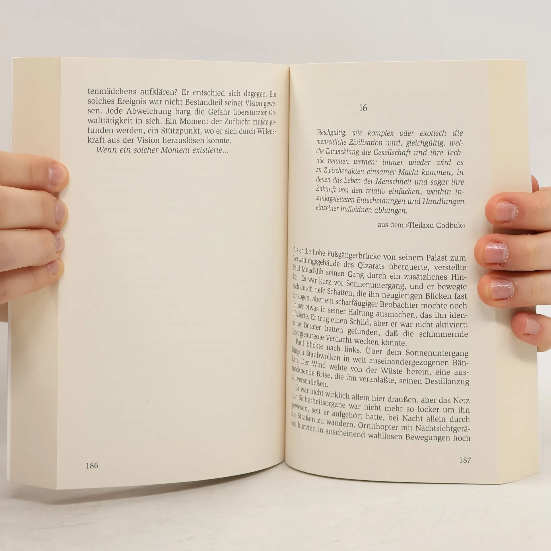 Was sind Gesetze? Versuche, die Raubtiernatur des Menschen zu sozialisieren? Paul Atreides, genannt Muad’dib, ist in der extrem menschenfeindlichen Wüste Arrakis‘ aufgewachsen und durch die harte Schule der Fremen gegangen. Die Wüstenbewohner haben ihn zu ihrem Propheten ernannt und folgen ihm bedingungslos. Sein Kampf um den Planeten entzündete den Djihad, der jetzt wie ein Sturmwind durch die Galaxis fegt. Pauls neues Imperium und seine Machtfülle rufen Neider auf den Plan, die seine Herrschaft brechen wollen. Und so mischen sich unter die Pilger, die nach Arrakis kommen, um den Erlöser zu sehen, Attentäter, menschliche Zeitbomben …
