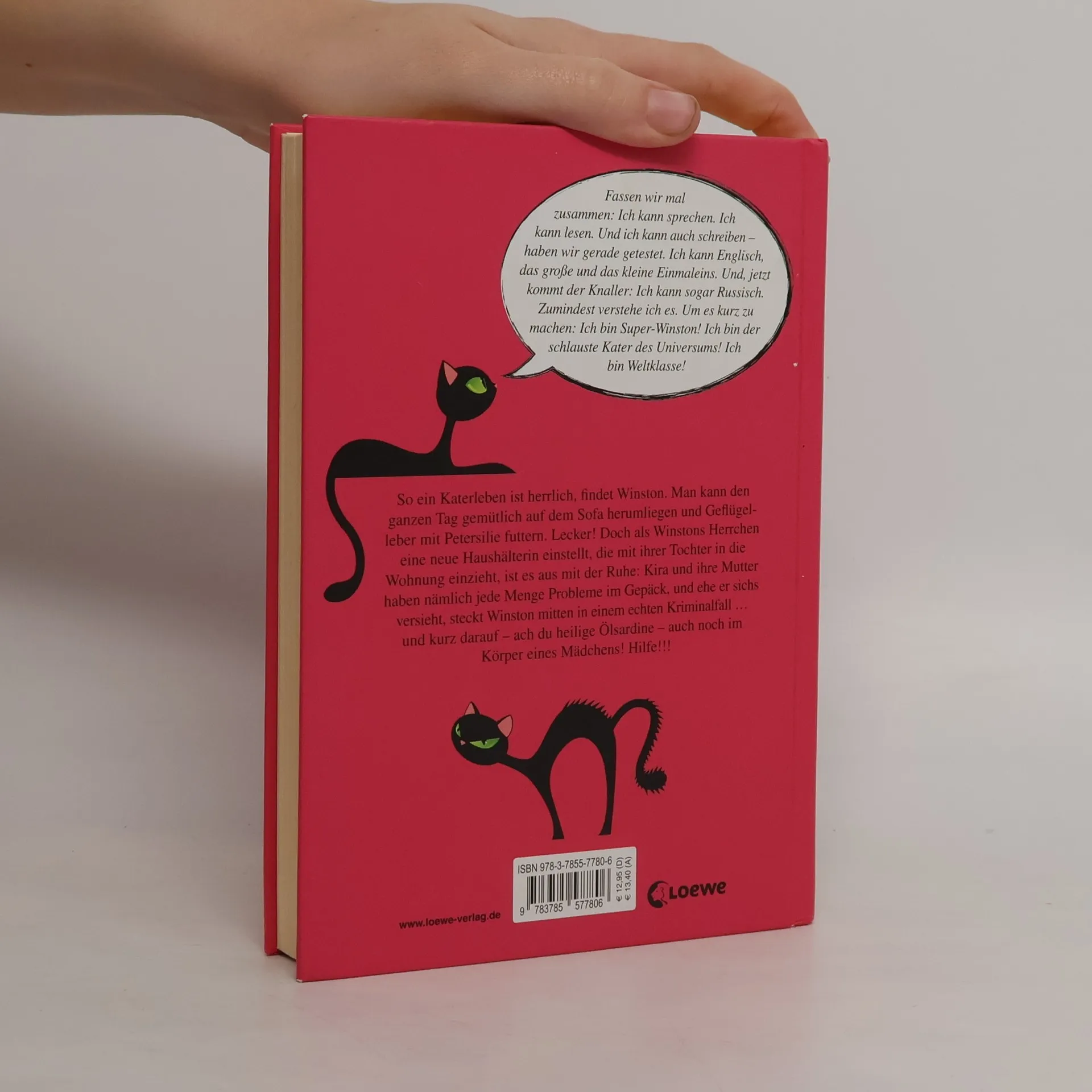 \"Fassen wir mal zusammen: Ich kann sprechen. Ich kann lesen. Und ich kann auch schreiben haben wir gerade getestet. Ich kann Englisch, das große und das kleine Einmaleins. Und, jetzt kommt der Knaller: Ich kann sogar Russisch. Zumindest verstehe ich es. Um es kurz zu machen. Ich bin Super-Winston! Ich bin die schlauste Katze des Universums! Ich bin Weltklasse!\" So ein Katerleben ist herrlich!, findet Winston. Man kann den ganzen Tag gemütlich auf dem Sofa herumliegen und Geflügelleber mit Petersilie futtern. Lecker! Doch als Winstons Herrchen eine neue Haushälterin einstellt, die mit ihrer Tochter in die Wohnung einzieht, ist es aus mit der Ruhe: Kira und ihre Mutter haben nämlich jede Menge Probleme im Gepäck, und bevor sich Winston versieht, steckt er mitten in einem echten Kriminalfall und kurz darauf ach du heilige Ölsardine auch noch im Körper eines Mädchens! Hilfe!!!