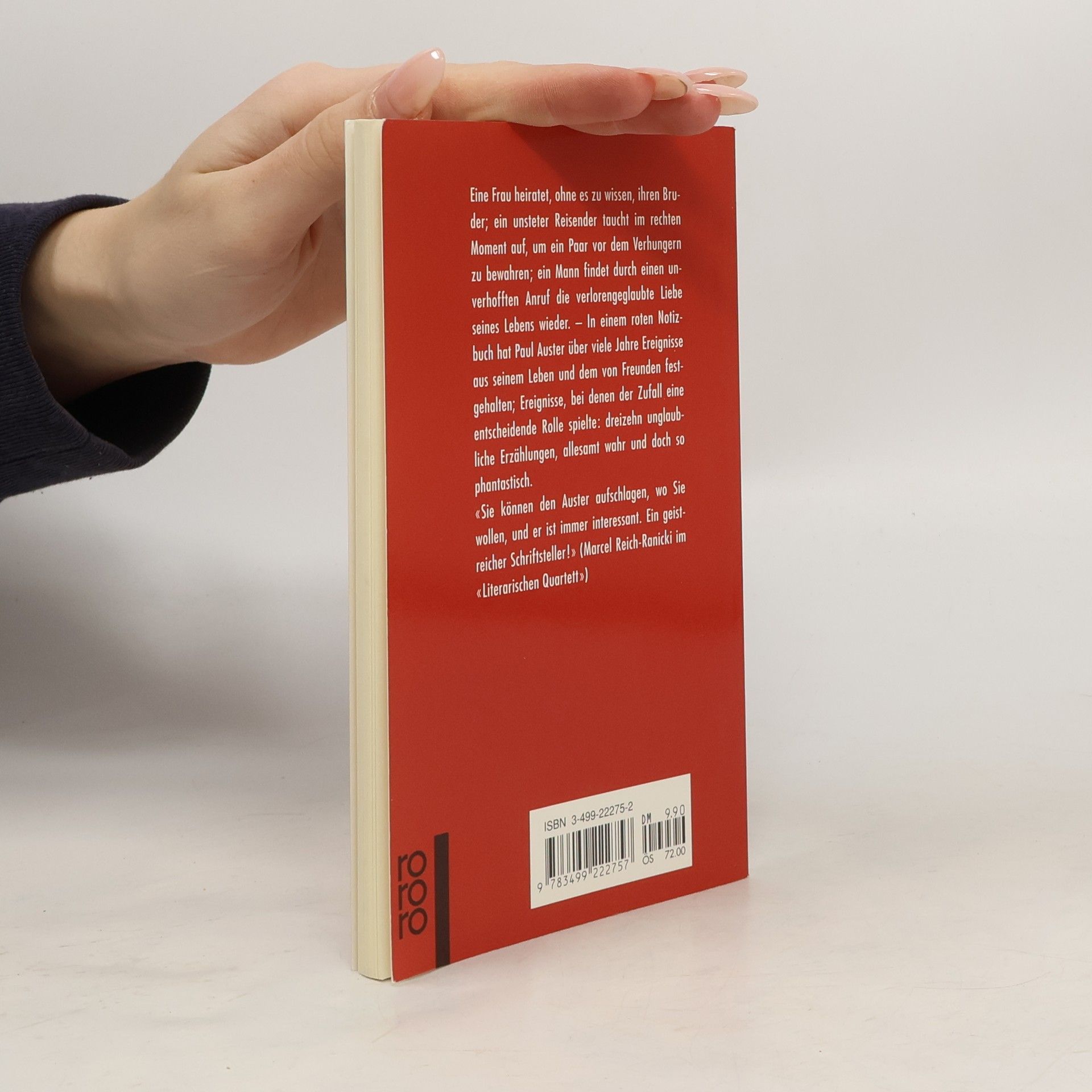 Dies ist Paul Austers legendäres „Red Notebook“ von 1995, erstmals vollständig auf Deutsch, in bibliophiler Ausstattung. Wie wirkt der Zufall auf unser Leben, und was steckt hinter dieser seltsamen Macht? Diese Fragen durchziehen Paul Austers gesamtes schriftstellerisches Werk. In einem roten Notizbuch hat er über die Jahre wahre Geschichten aus seinem Leben und aus dem von Freunden und Bekannten festgehalten, in denen die unvorhersehbare, wechselhafte, ja bisweilen paradoxe Natur der menschlichen Erfahrung deutlich zutage tritt: fünfundzwanzig unglaubliche Erzählungen, wahr und doch so phantastisch, dass man sie am liebsten einer durchtriebenen Schriftstellerphantasie zuschreiben möchte, um sich nicht von ihrer Magie erschrecken zu lassen. Ein verbrannter Zwiebelkuchen, eine falsche Telefonnummer, ein vom Blitz getroffener Junge, ein in einem Pariser Hotelzimmer vergessener Zettel - sie und anderes lösen merkwürdige Ereignisse aus und führen nebenbei zu einer einzigartigen Ars poetica, einem literarischen Manifest, das in die unveränderliche Form reinsten Erzählens gebracht wurde.