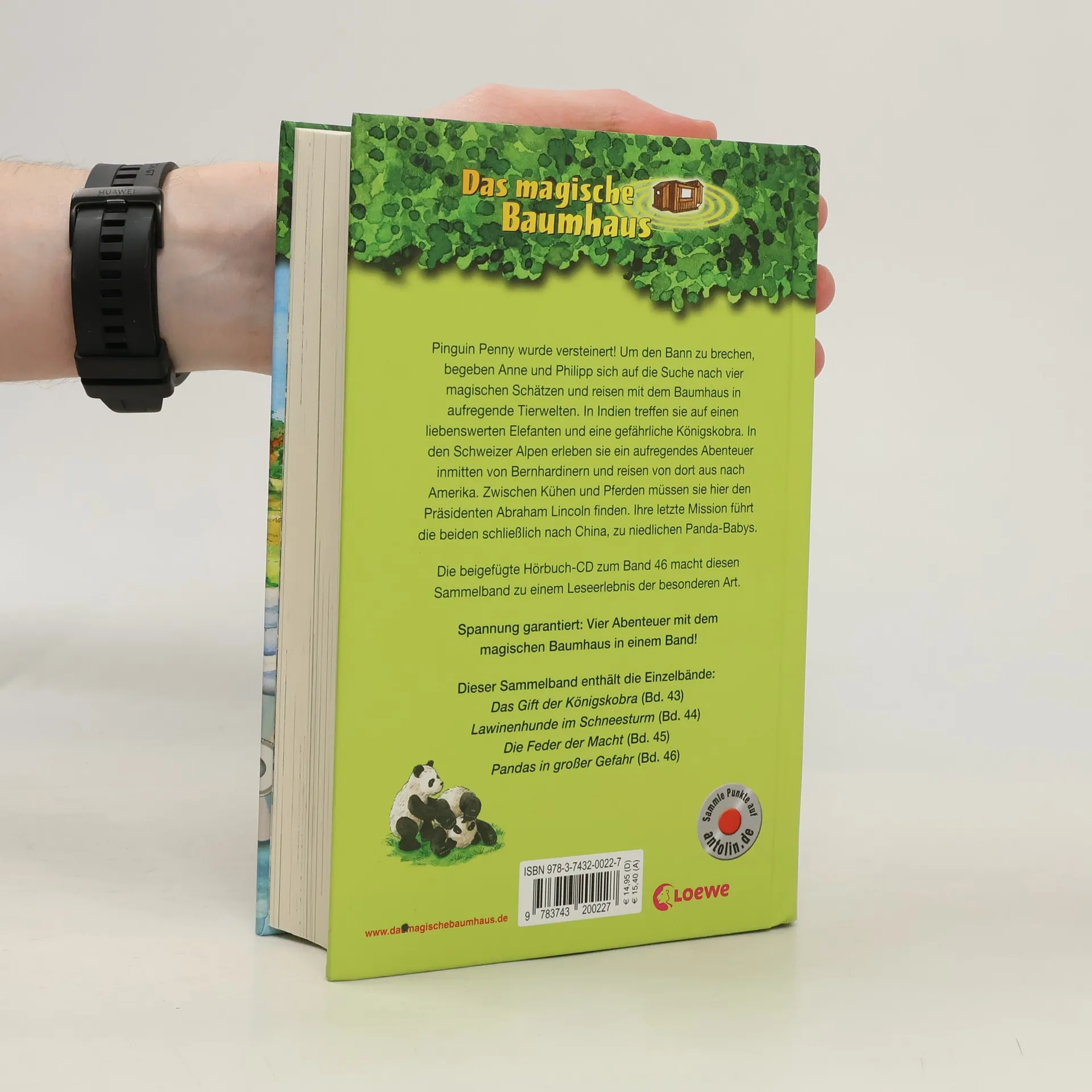 Das Buch ist in Buchhandlungen und Online-Shops erhältlich! Es bietet spannende Themen wie Abenteuer, Tiere und fremde Länder. Mit hochwertigem Hardcover und vielen Illustrationen überzeugt es durch ein ausgewogenes Text-Bild-Verhältnis, große Schrift und kurze Kapitel. In diesem Sammelband sind vier Abenteuer mit dem magischen Baumhaus vereint: Pinguin Penny wurde versteinert, und Anne und Philipp müssen vier magische Schätze finden, um den Bann zu brechen. Ihre erste Reise führt sie nach Indien, wo sie einem liebenswerten Elefanten und einer gefährlichen Königskobra begegnen. In den Schweizer Alpen erleben sie ein aufregendes Abenteuer mit Bernhardinern und reisen anschließend nach Amerika, wo sie den Präsidenten Abraham Lincoln suchen. Ihre letzte Mission führt sie nach China, zu kleinen Panda-Babys. Die beigefügte Hörbuch-CD macht diesen Sammelband zu einem besonderen Leseerlebnis. Er enthält die Einzelbände 43-46: „Das Gift der Königskobra“, „Lawinenhunde im Schneesturm“, „Die Feder der Macht“ und „Pandas in großer Gefahr“. Die beliebte Kinderbuch-Reihe von Bestsellerautorin Mary Pope Osborne lässt die Geschwister Anne und Philipp durch die Zeit reisen, spannende Abenteuer erleben und berühmte Persönlichkeiten kennenlernen. Alle Sammelbände sind bei Antolin gelistet.