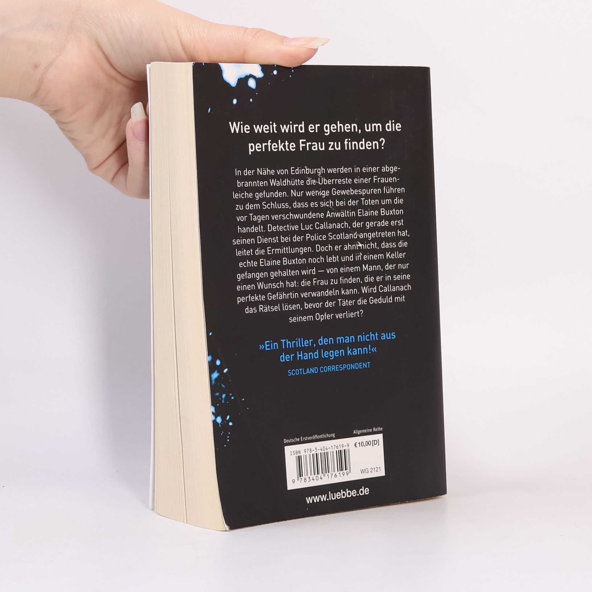 WIE WEIT WIRD ER GEHEN, UM DIE PERFEKTE FRAU ZU FINDEN? ... In der Nähe von Edinburgh werden in einer abgebrannten Waldhütte die Überreste einer Frauenleiche gefunden. Nur wenige Gewebespuren führen zu dem Schluss, dass es sich bei der Toten um die vor Tagen verschwundene Anwältin Elaine Buxton handelt. Detective Luc Callanach, der gerade erst seinen Dienst bei der Police Scotland angetreten hat, leitet die Ermittlungen. Doch er ahnt nicht, dass die echte Elaine Buxton noch lebt und in einem Keller gefangen gehalten wird — von einem Mann, der nur einen Wunsch hat: die Frau zu finden, die er in seine perfekte Gefährtin verwandeln kann. Wird Callanach das Rätsel lösen, bevor der Täter die Geduld mit seinem Opfer verliert? ... »Ein Thriller, den man nicht aus der Hand legen kann!« Scotland Correspondent