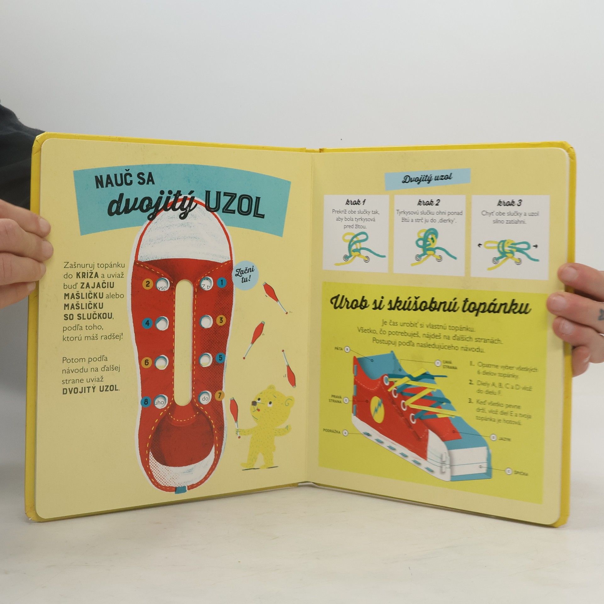 Knižka Nauč sa... Ako si zaviazať šnúrky ťa naučí šnurovať do kríža zajačiu mašličku mašličku so slučkou dvojitý uzol Okrem toho, že sa naučíte zaviazať si topánky, užijete si plno zábavy pri trénovaní na skúšobnej topánke, ktorú si sami vyrobíte!