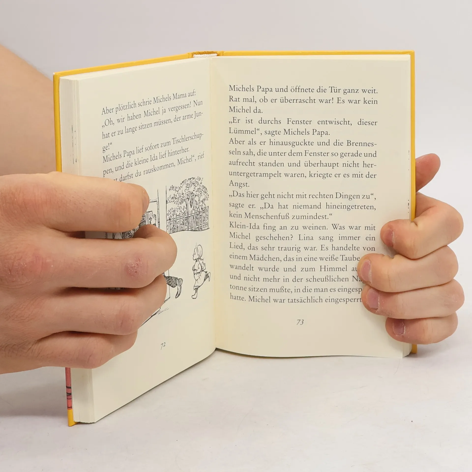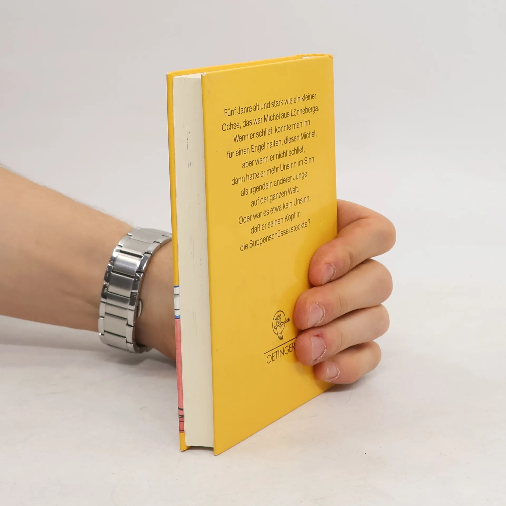"Fünf Jahre alt und stark wie ein kleiner Ochse, das war Michel aus Lönneberga. Wenn er schlief konnte man ihn für einen Engel halten, diesen Michael, aber wenn er nicht schlief, dann hatte er mehr Unsinn im Sinn als irgendein anderer Junge auf der ganzen Welt. Oder war es etwa kein Unsinn, daß er seinen Kopf in die Suppenschüssel steckte?"--P. [4] of cover.