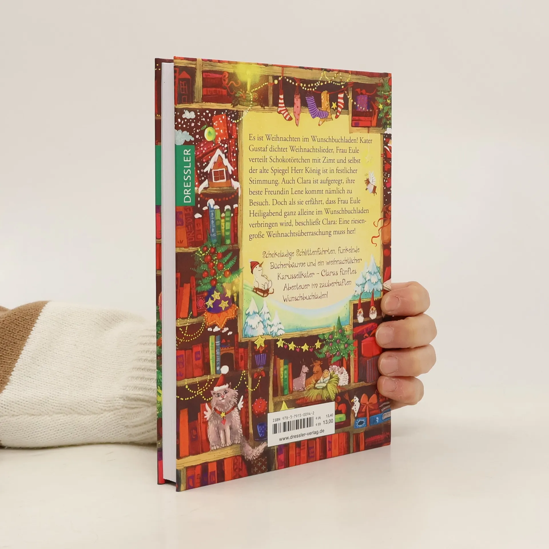 Magische Weihnachten im Wunschbuchladen Es weihnachtet sehr im zauberhaften Wunschbuchladen von Frau Eule. Gustaf, der sprechende Kater, hat viel Vergnügen auf dem Weihnachtsmarkt, Claras beste Freundin Lene kommt zu Besuch, und alle freuen sich auf Heiligabend. Doch dann findet Clara heraus, dass Frau Eule die schönste Zeit des Jahres ganz alleine verbringt. Das kann Clara natürlich nicht zulassen! Zusammen mit allen Bücherfreunden der Stadt macht sie Frau Eule eine riesengroße Weihnachtsfreude! „Der zauberhafte Wunschbuchladen. Weihnachten mit Frau Eule“ von Katja Frixe versüßt die Zeit bis zum Fest. Alle 6 Bände der Reihe sind sowohl als Hardcover als auch als E-Book verfügbar: Band 1: Der zauberhafte Wunschbuchladen Band 2: Der hamsterstarke Harry Band 3: Schokotörtchen für alle! Band 4: Die wilden Vier Band 5: Weihnachten mit Frau Eule Band 6: Eine Schule hält zusammen