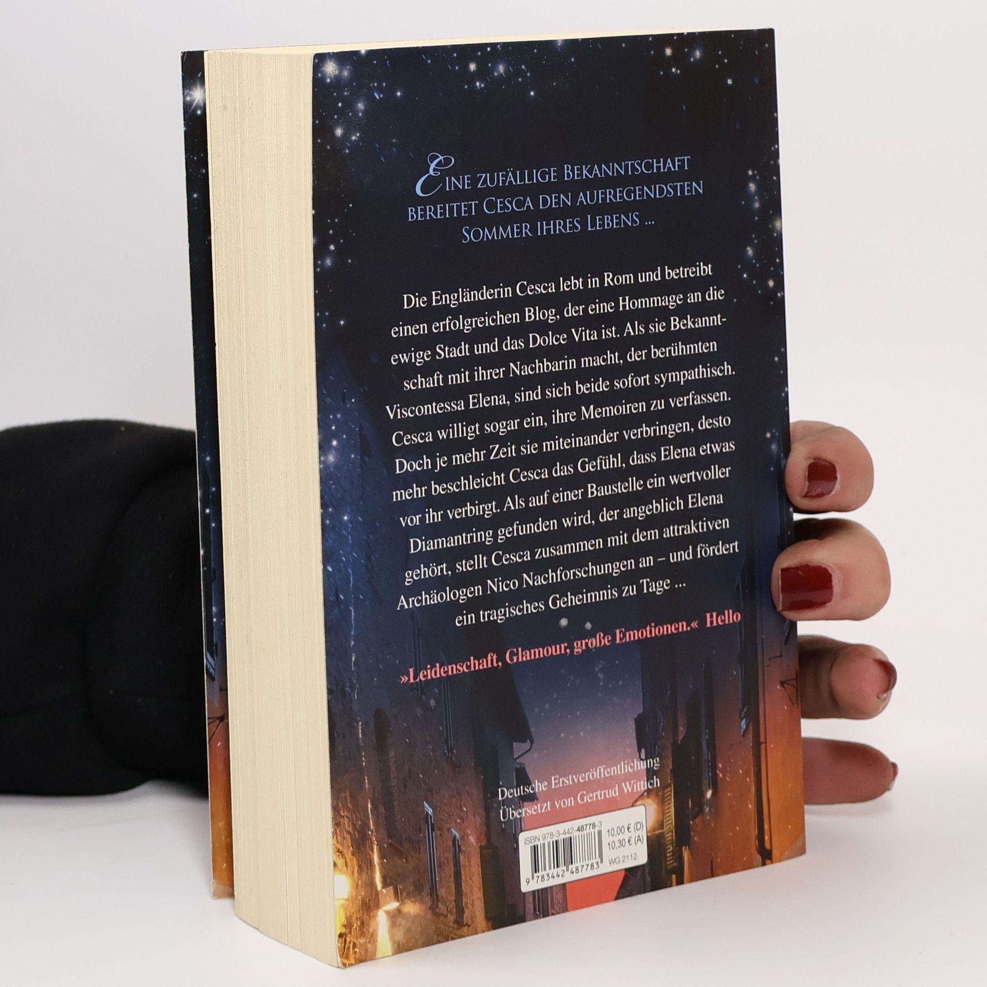 Die Engländerin Cesca lebt in Rom und betreibt einen erfolgreichen Blog, der eine Hommage an die ewige Stadt und das Dolce Vita ist. Als sie Bekanntschaft mit ihrer Nachbarin macht, der berühmten Viscontessa Elena, sind sich beide sofort sympathisch. Nach einiger Zeit willigt Cesca sogar ein, Elenas Memoiren zu verfassen. Doch je mehr Zeit sie miteinander verbringen, desto mehr beschleicht Cesca das Gefühl, dass Elena etwas vor ihr verbirgt. Als auf einer Baustelle ein wertvoller Diamantring gefunden wird, der angeblich Elena gehört, stellt Cesca zusammen mit dem attraktiven Archäologen Nico Nachforschungen an – und fördert ein tragisches Geheimnis zu Tage ...