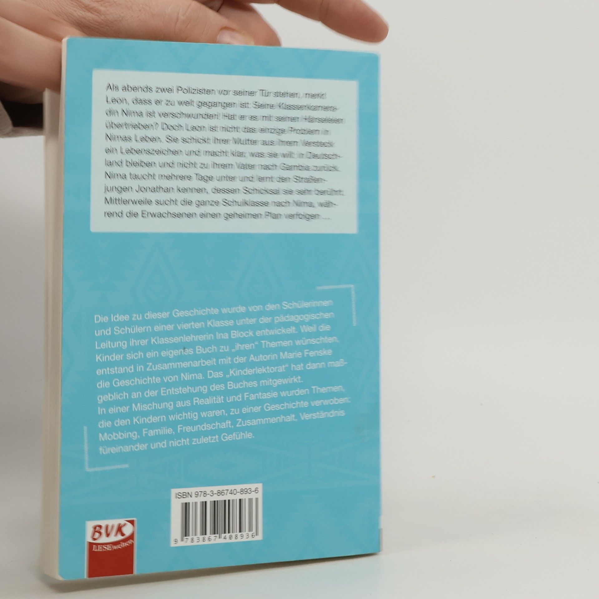 Als abends zwei Polizisten vor seiner Tür stehen, merkt Leon, dass er zu weit gegangen ist: Seine Klassenkameradin Nima ist verschwunden! Hat er es mit seinen Hänseleien übertrieben? Doch Leon ist nicht das einzige Problem in Nimas Leben. Sie schickt ihrer Mutter aus ihrem Versteck ein Lebenszeichen und macht klar, was sie will: in Deutschland bleiben und nicht zu ihrem Vater nach Gambia zurück. Nima taucht mehrere Tage unter und lernt den Straßenjungen Jonathan kennen, dessen Schicksal sie sehr berührt. Mittlerweile sucht die ganze Schulklasse nach Nima, während die Erwachsenen einen geheimen Plan verfolgen … Die Idee zu dieser Geschichte wurde von den Schülerinnen und Schülern einer vierten Klasse unter der pädagogischen Leitung ihrer Klassenlehrerin Ina Block entwickelt. Weil die Kinder sich ein eigenes Buch zu „ihren“ Themen wünschten, entstand in Zusammenarbeit mit der Autorin Marie Fenske die Geschichte von Nima. Das „Kinderlektorat“ hat dann maßgeblich an der Entstehung des Buches mitgewirkt. In einer Mischung aus Realität und Fantasie wurden Themen, die den Kindern wichtig waren, zu einer Geschichte verwoben: Mobbing, Familie, Freundschaft, Zusammenhalt, Verständnis füreinander und nicht zuletzt Gefühle. Empfohlen von Stiftung Lesen