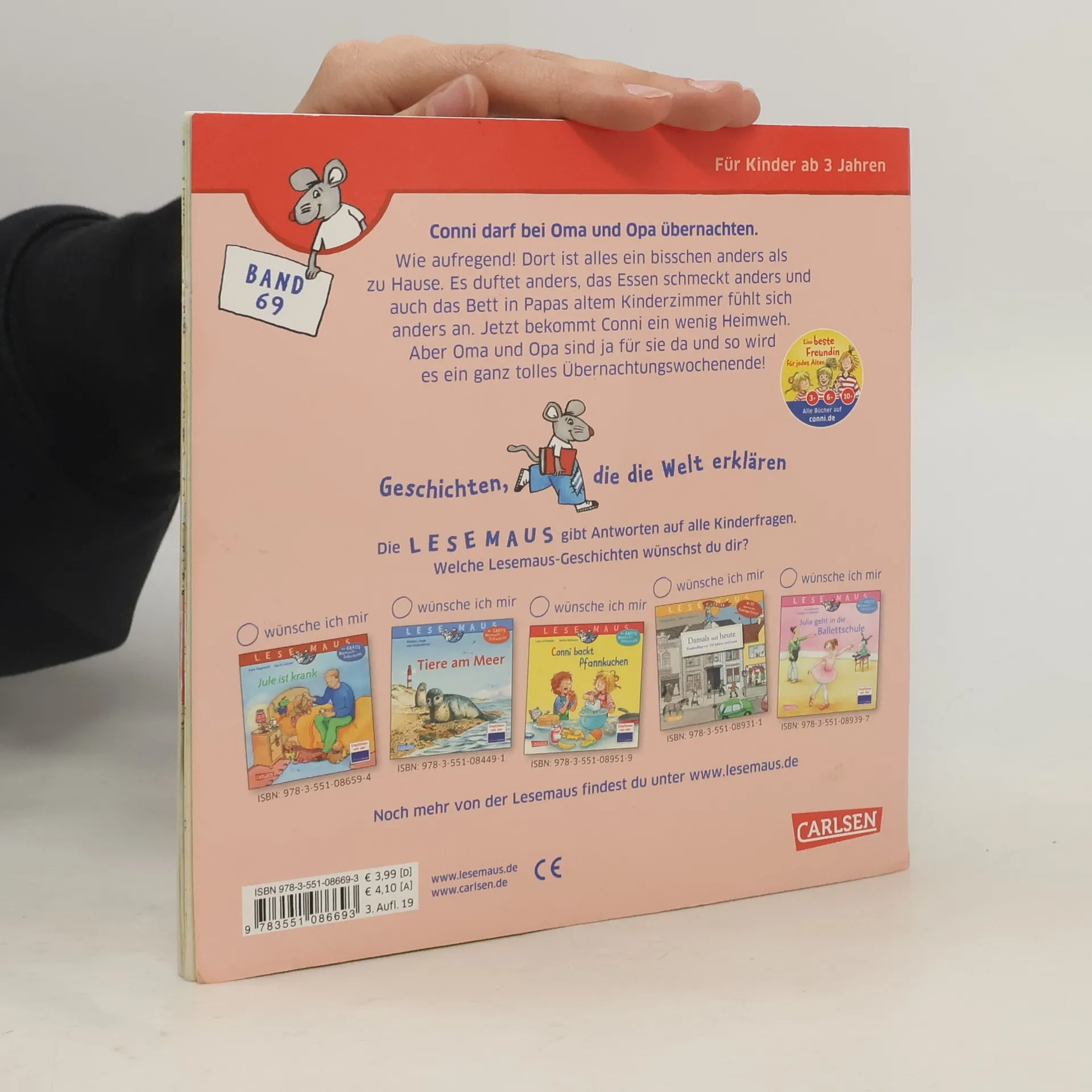 ***Eine liebevolle Bilderbuchgeschichte für alle Conni-Fans – und ihre Großeltern!*** Conni ist ganz aufgeregt! Sie darf das Wochenende über zu Oma und Opa. Mit Übernachtung und allem Drum und Dran! Bei den Großeltern ist es ganz wunderbar – und alles ist ein bisschen anders als zu Hause. Es duftet anders, das Essen schmeckt anders und das Bett in Papas altem Kinderzimmer fühlt sich anders an. Conni bekommt ein bisschen Heimweh. Aber zum Glück sind Oma und Opa für sie da! Und das Übernachtungswochenende wird ein richtig kleines Abenteuer. Ein wertvoller Begleiter und perfekt als Geschenk – für Großeltern und Enkelkinder! Eine neue tolle Conni-Vorlesegeschichte aus dem Kinderalltag Warmherzig und kindgerecht erzählt ***LESEMAUS – Geschichten, die die Welt erklären!*** Die Bilderbücher für Kinder ab 3 Jahren sind ideal zum gemeinsamen Anschauen und Vorlesen. Verständliche Texte und hochwertige Illustrationen vermitteln erstes Sachwissen zu wichtigen Themen aus dem Kinderalltag. Empfohlen von der Stiftung Lesen.