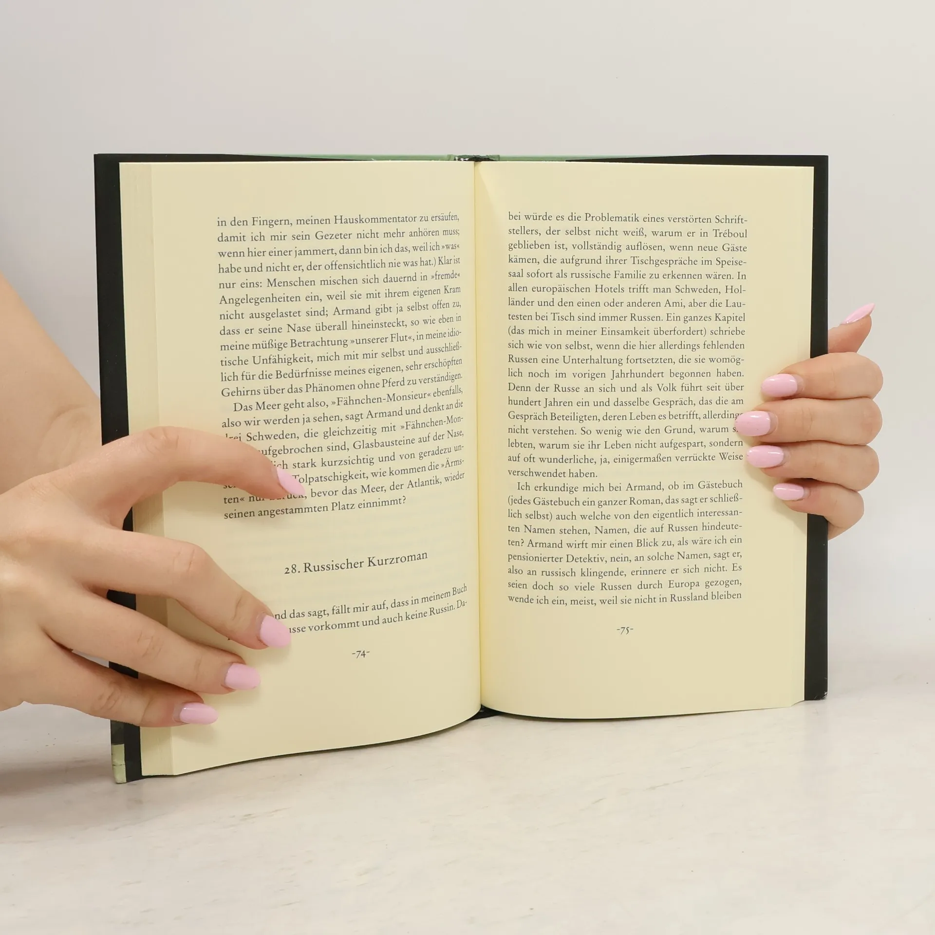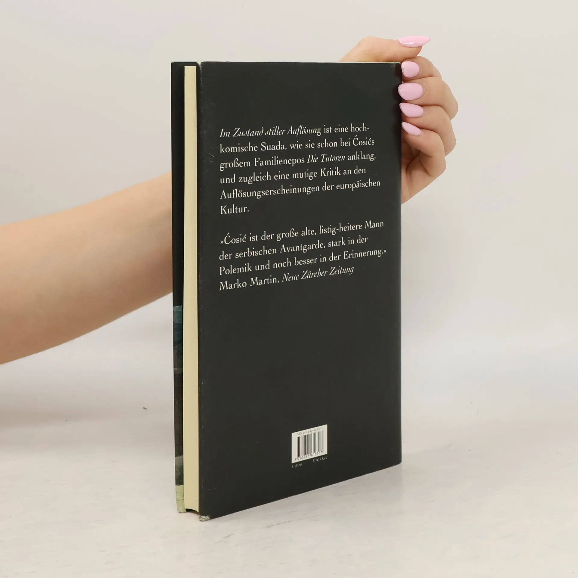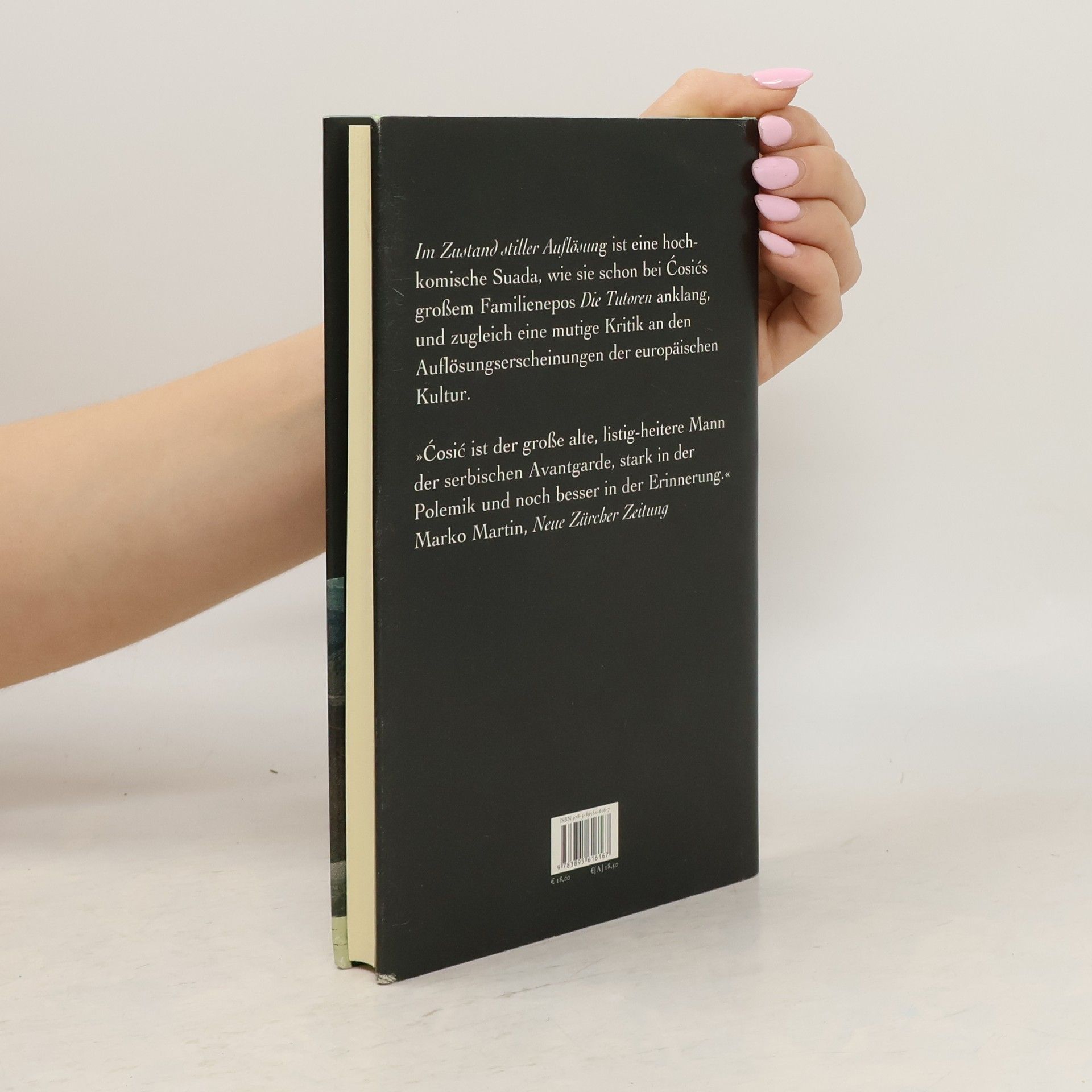 Die Reise eines Schriftstellers auf den Spuren Marcel Prousts in der Normandie geht gleich zu Beginn gründlich schief, denn das befreundete französische Ehepaar will in ein bretonisches Städtchen, in dem Proust nie war. Die kleine Reisegesellschaft quartiert sich im Hotel Armor ein. Der übergriffige Portier, der vor Kraft und Klischees über »uns« und »die anderen« nur so strotzt, liefert dem kränkelnden Schriftsteller reichlich Stoff zum Nachdenken. Nachdem seine Frau zu einem Vortrag enteilt und das befreundete Ehepaar wieder in Paris ist, bleibt er allein im tristen Tréboul zurück und wertet fröhlich grummelnd Dekadenz und Langeweile um. Seine eigene Suche nach der verlorenen Zeit karikiert jedes Pathos, voller Selbstironie und Witz zerpflückt der Ich-Erzähler eine vermeintliche Selbstverständlichkeit nach der anderen, am Ende auch den eigenen Traum vom Buch über Proust. »Im Zustand stiller Auflösung« ist eine hochkomische Suada, wie sie schon bei Ćosićs großem Familienepos Die Tutoren anklang. Auch hier verbirgt sich hinter seinem geistreichen Hadern eine mutige Kritik an den Auflösungserscheinungen der europäischen Kultur.