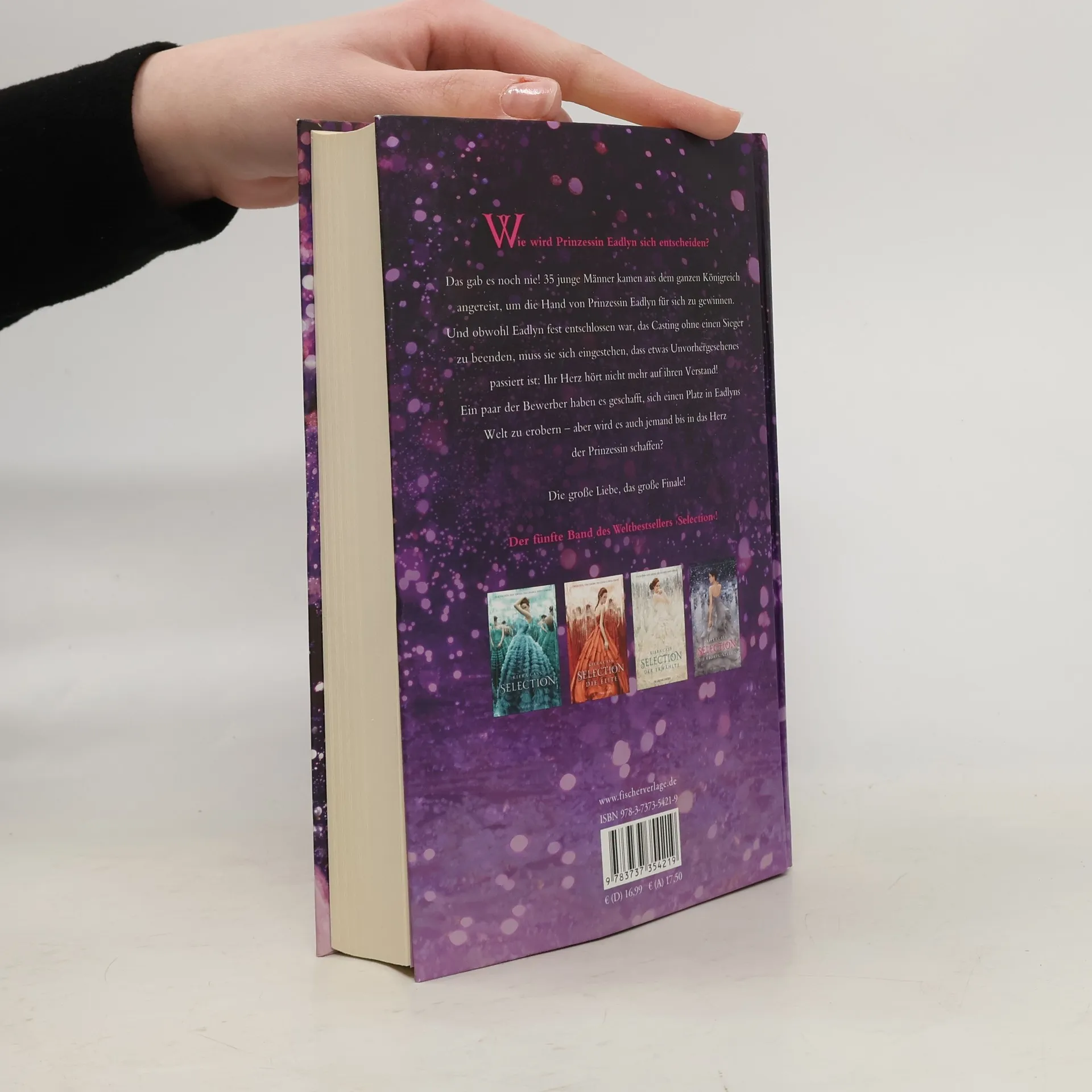 Die große Liebe, das große Finale - darauf haben alle ›Selection‹-Fans gewartet! Als das Casting begann, war Eadlyn wild entschlossen, sich nicht zu verlieben und keinen der Bewerber an sich heranzulassen. Doch nun muss sie sich eingestehen, dass einige von ihnen doch Eindruck bei ihr hinterlassen haben: Henri, der charmante Lockenkopf, und sein bester Freund Erik. Der aufmerksame und rücksichtsvolle Hale. Der selbstsichere und attraktive Ean. Und natürlich Kile, Eadlyns Lieblingsfeind aus Sandkastenzeiten, der sie zu ihrem Ärger immer wieder aus der Reserve lockt. Sie alle haben es geschafft, einen Platz in Eadlyns Welt zu erobern. Aber wird es auch jemand in das Herz der Prinzessin schaffen? Der 5. Band des internationalen Weltbestsellers - wunderbar romantisch und ein krönender Abschluss!