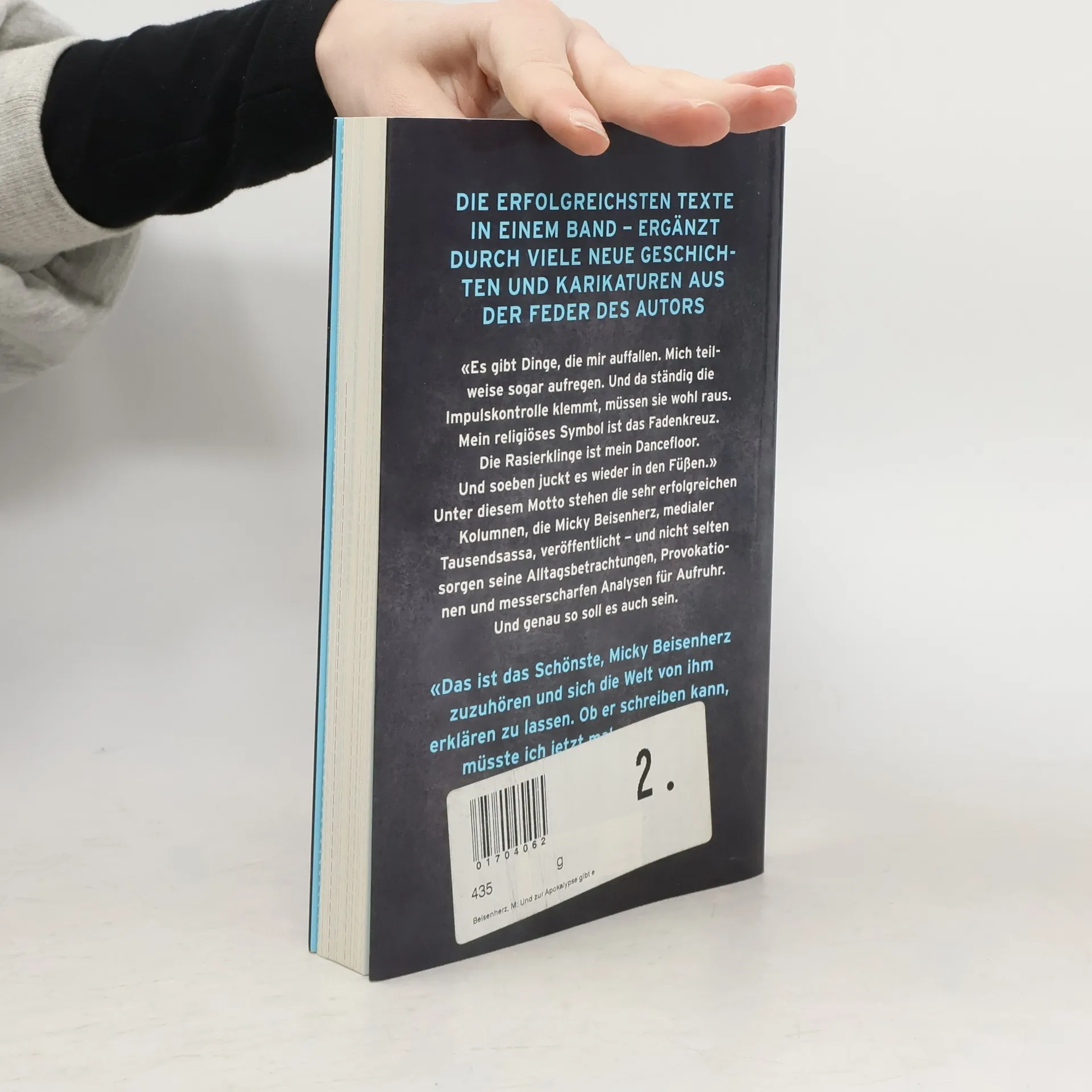«Es gibt Dinge, die mir auffallen. Mich teilweise sogar aufregen. Und da ständig die Impulskontrolle klemmt, müssen sie wohl raus. Mein religiöses Symbol ist das Fadenkreuz. Die Rasierklinge ist mein Dancefloor. Und soeben juckt es wieder in den Füßen.» Unter diesem Motto stehen die sehr erfolgreichen Kolumnen, die Micky Beisenherz, medialer Tausendsassa, im Stern veröffentlicht – und nicht selten sorgen seine Alltagsbetrachtungen, Provokationen und messerscharfen Analysen für Aufruhr. Und genau so soll es auch sein – Beisenherz versteht es, die Klaviatur der sozialen Medien meisterhaft zu spielen.