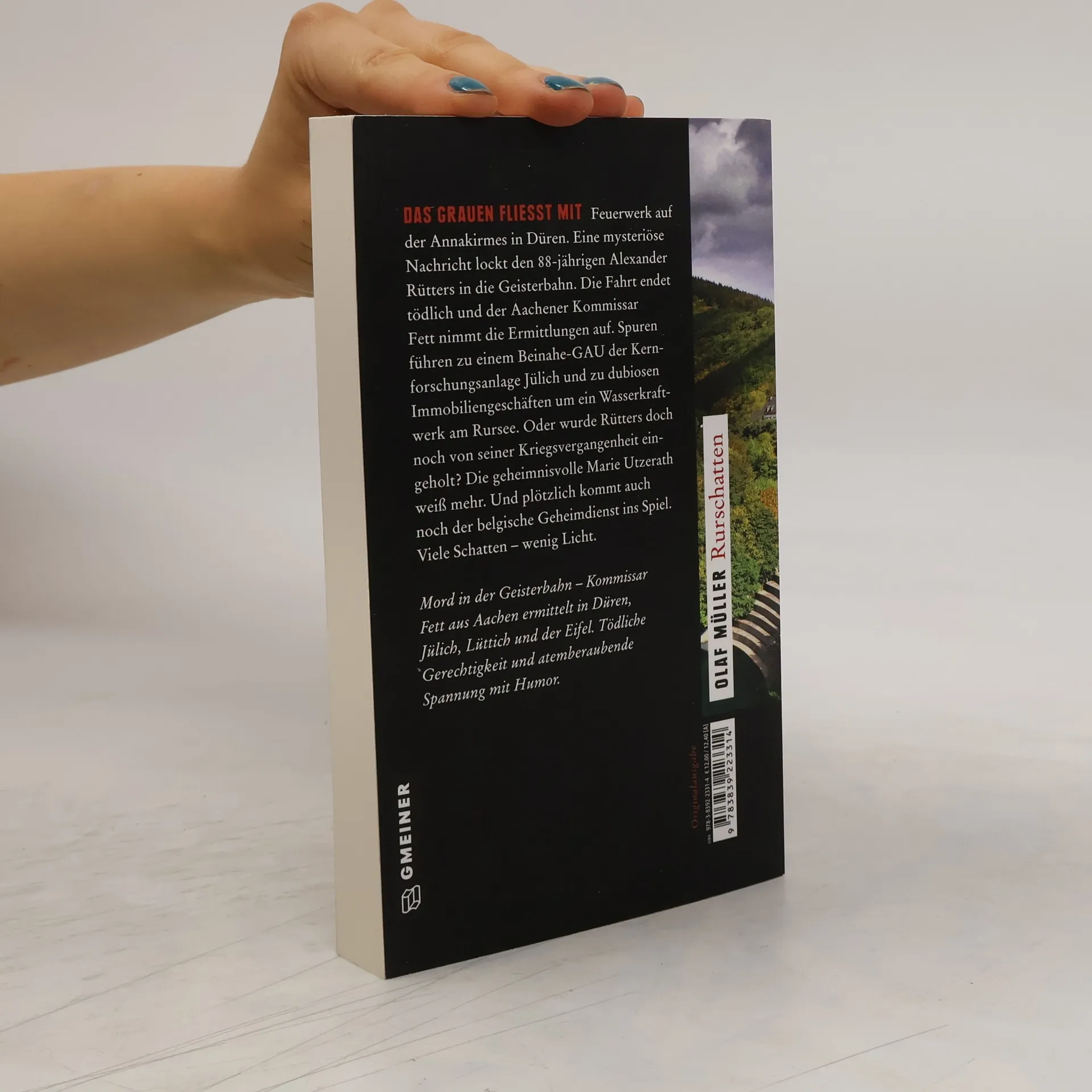 Feuerwerk auf der Annakirmes in Düren. Eine mysteriöse Nachricht lockt den 88-jährigen Alexander Rütters in die Geisterbahn. Die Fahrt endet tödlich und der Aachener Kommissar Fett nimmt die Ermittlungen auf. Spuren führen zu einem Beinahe-GAU der Kernforschungsanlage Jülich und zu dubiosen Immobiliengeschäften um ein Wasserkraftwerk am Rursee. Oder wurde Rütters doch noch von seiner Kriegsvergangenheit eingeholt? Die geheimnisvolle Marie Utzerath weiß mehr. Und plötzlich kommt auch noch der belgische Geheimdienst ins Spiel. Viele Schatten - wenig Licht.
