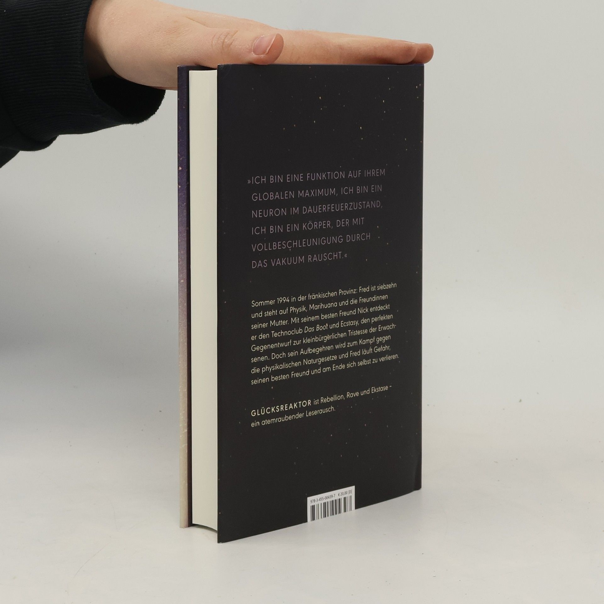 Ein Roman über Freundschaft, Freiheit und die immerwährende Suche nach dem echten Leben. Sommer 1994 in der fränkischen Provinz: Fred ist siebzehn und steht auf Physik, Marihuana und die Freundinnen seiner Mutter. Mit seinem besten Freund Nick entdeckt er den Technoclub Das Boot und Ecstasy, den perfekten Gegenentwurf zur kleinbürgerlichen Tristesse der Erwachsenen. Doch sein Aufbegehren wird zum Kampf gegen die physikalischen Naturgesetze und Fred läuft Gefahr, seinen besten Freund und am Ende sich selbst zu verlieren. GLÜCKSREAKTOR ist Rebellion, Rave und Ekstase – ein atemraubender Leserausch.