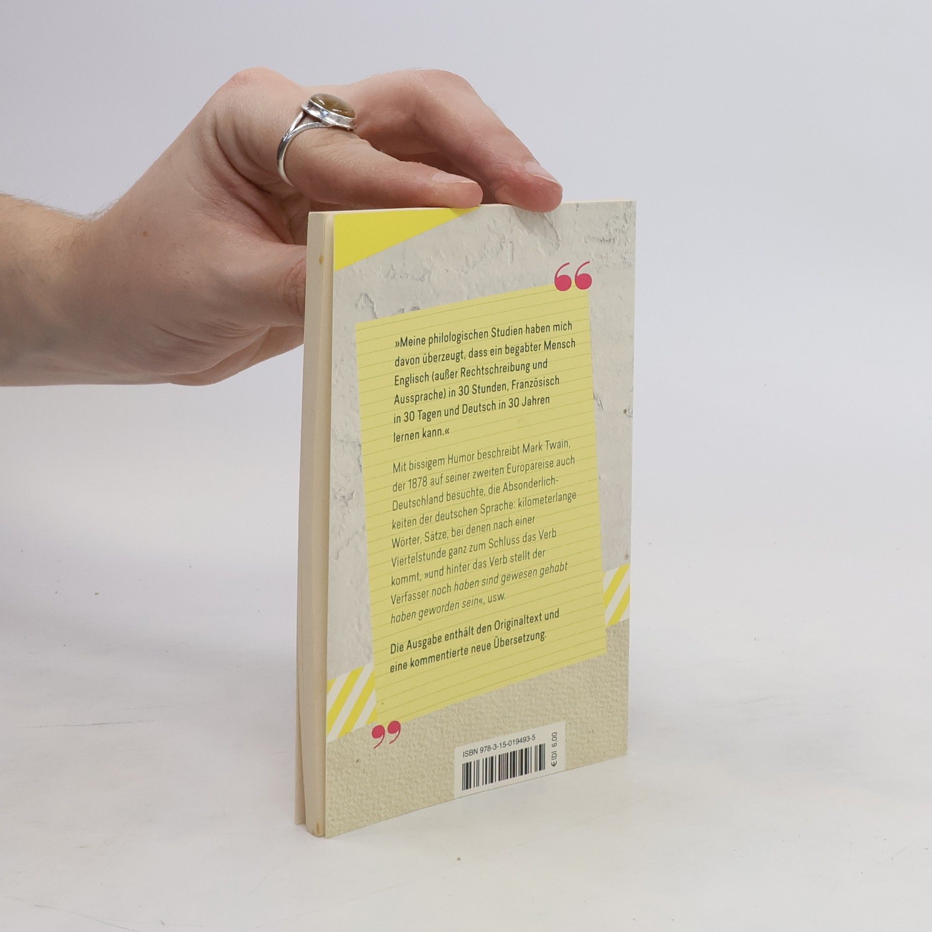 »Meine philologischen Studien haben mich davon überzeugt, dass ein begabter Mensch Englisch (außer Rechtschreibung und Aussprache) in 30 Stunden, Französisch in 30 Tagen und Deutsch in 30 Jahren lernen kann.« Mit bissigem Humor beschreibt Mark Twain, der 1878 auf seiner zweiten Europareise auch Deutschland besuchte, die Absonderlichkeiten der deutschen Sprache: kilometerlange Wörter, Sätze, bei denen nach einer Viertelstunde ganz zum Schluss das Verb kommt, »und hinter das Verb stellt der Verfasser noch haben sind gewesen gehabt haben geworden sein «. Das ist äußerst amüsant zu lesen, zumal wenn man, wie hier, das Original daneben hat, in dem die deutschen Wörter noch fremdartiger wirken. Und ganz nebenbei lernt man dadurch die eigene Sprache noch besser kennen.
