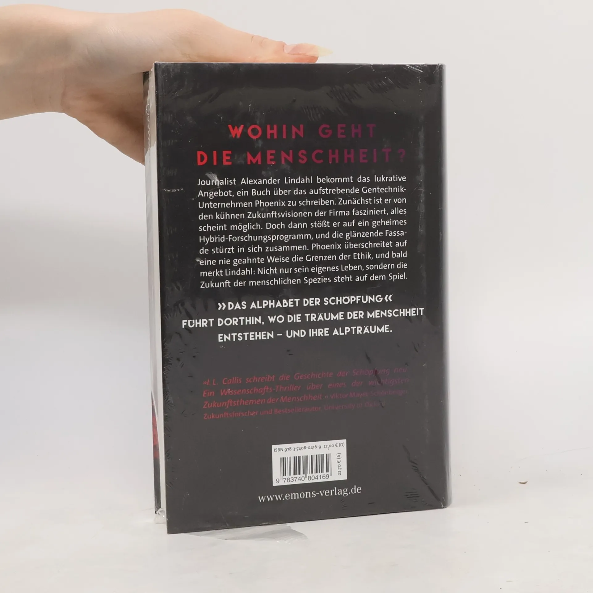 Ein Biotech-Unternehmen spielt mit der Schöpfung. Journalist Alexander Lindahl bekommt das lukrative Angebot, ein Buch über das aufstrebende Gentechnik- Unternehmen Phoenix zu schreiben. Zunächst ist er von den kühnen Zukunftsvisionen der Firma fasziniert, alles scheint möglich. Doch dann stößt er auf ein geheimes Hybrid-Forschungsprogramm, und die glänzende Fassade stürzt in sich zusammen. Phoenix überschreitet auf eine nie geahnte Weise die Grenzen der Ethik, und bald merkt Lindahl: Nicht nur sein eigenes Leben, sondern die Zukunft der menschlichen Spezies steht auf dem Spiel.