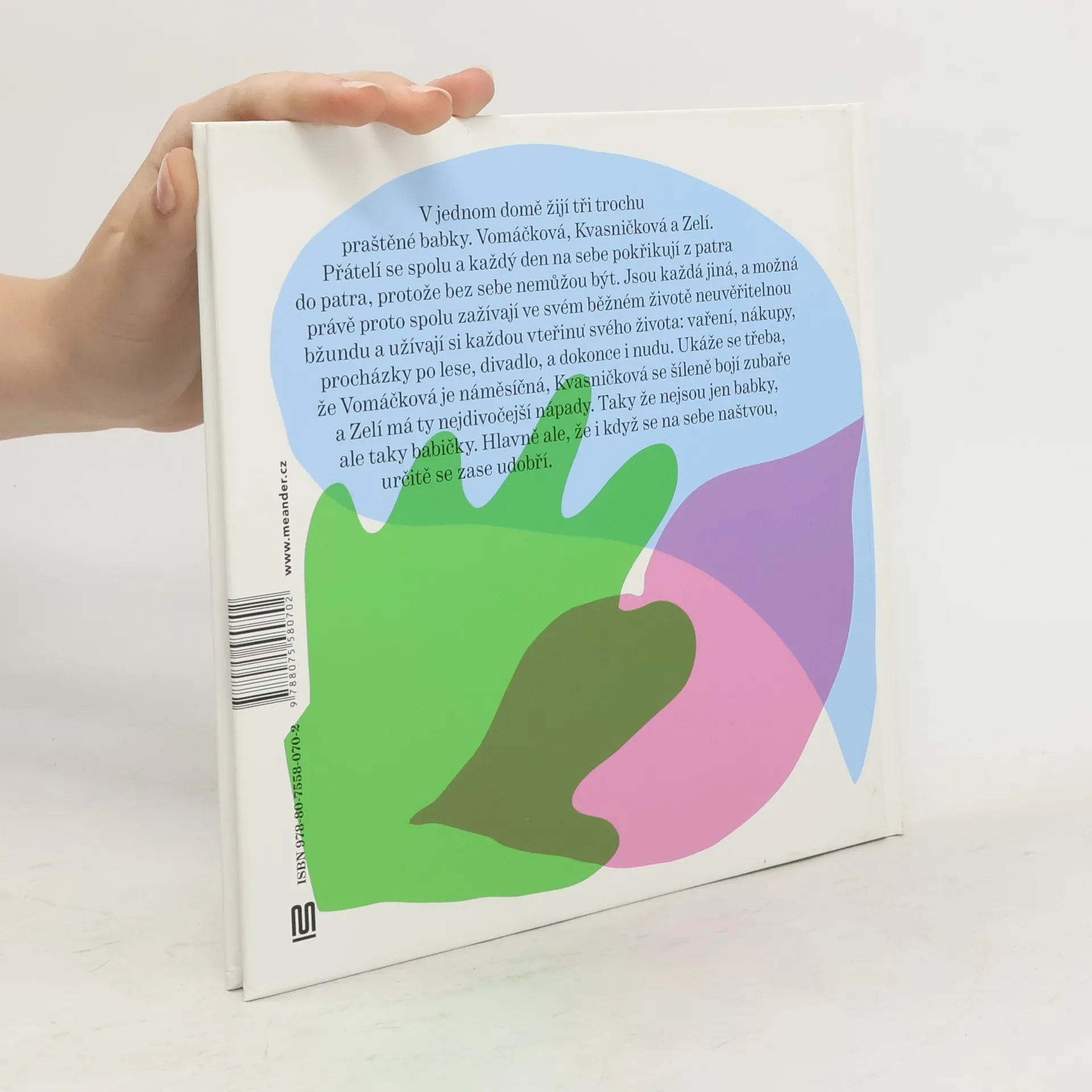 V jednom domě žijí tři trochu praštěné babky. Vomáčková, Kvasničková a Zelí. Přátelí se spolu a každý den na sebe pokřikují z patra do patra, protože bez sebe nemůžou být. Jsou každá jiná, a možná právě proto spolu zažívají ve svém běžném životě neuvěřitelnou bžundu a užívají si každou vteřinu svého života: vaření, nákupy, procházky po lese, divadlo, a dokonce i nudu. Ukáže se třeba, že Vomáčková je náměsíčná, Kvasničková se šíleně bojí zubaře a Zelí má ty nejdivočejší nápady. Taky že nejsou jen babky, ale taky babičky. Hlavně ale, že i když se na sebe naštvou, určitě se zase udobří. Kniha plná radosti ze života od babičky – a taky maminky, herečky, zpěvačky a režisérky – Marky Míkové je určená ke společnému čtení babiček (i dědečků!) s jejich vnoučaty. Vtipnými ilustracemi ji dotvořila výtvarnice ještě školou povinná, talentovaná Kristina Fingerlandová.