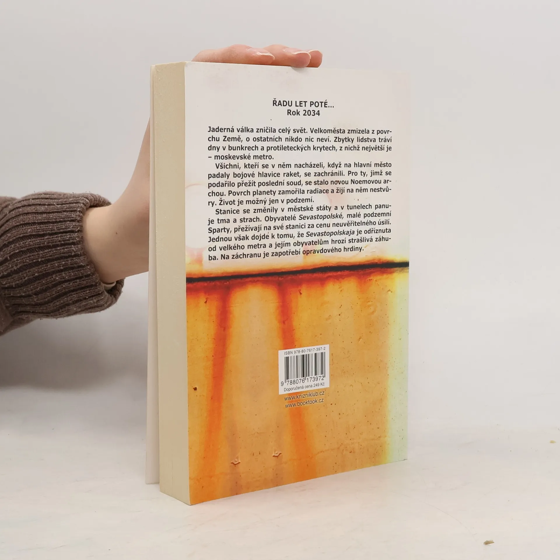 3. vydání. ŘADU LET POTÉ… Rok 2034 Jaderná válka zničila celý svět. Velkoměsta zmizela z povrchu Země, o ostatních nikdo nic neví. Zbytky lidstva tráví dny v bunkrech a protileteckých krytech, z nichž největší je – moskevské metro. Všichni, kteří se v něm nacházeli, když na hlavní město padaly bojové hlavice raket, se zachránili. Pro ty, jimž se podařilo přežít poslední soud, se stalo novou Noemovou archou. Povrch planety zamořila radiace a žijí na něm nestvůry. Život je možný jen v podzemí. Stanice se změnily v městské státy a v tunelech panuje tma a strach. Obyvatelé Sevastopolské, malé podzemní Sparty, přežívají na své stanici za cenu neuvěřitelného úsilí. Jednou však dojde k tomu, že Sevastopolskaja je odříznuta od velkého metra a jejím obyvatelům hrozí strašlivá záhuba. Na záchranu je zapotřebí opravdového hrdiny.