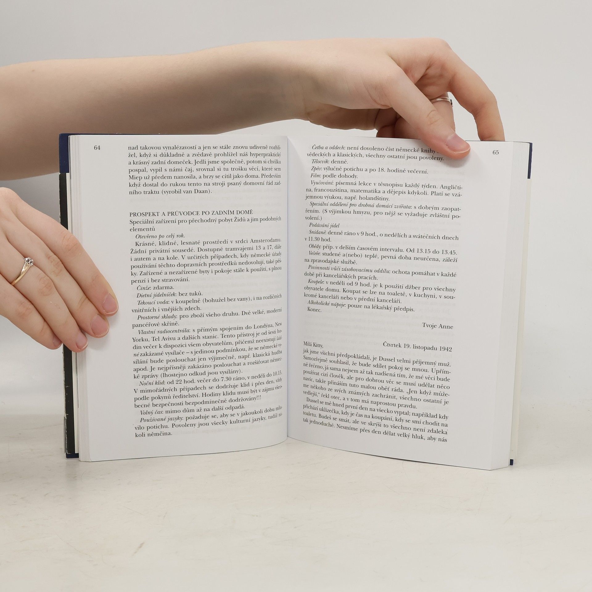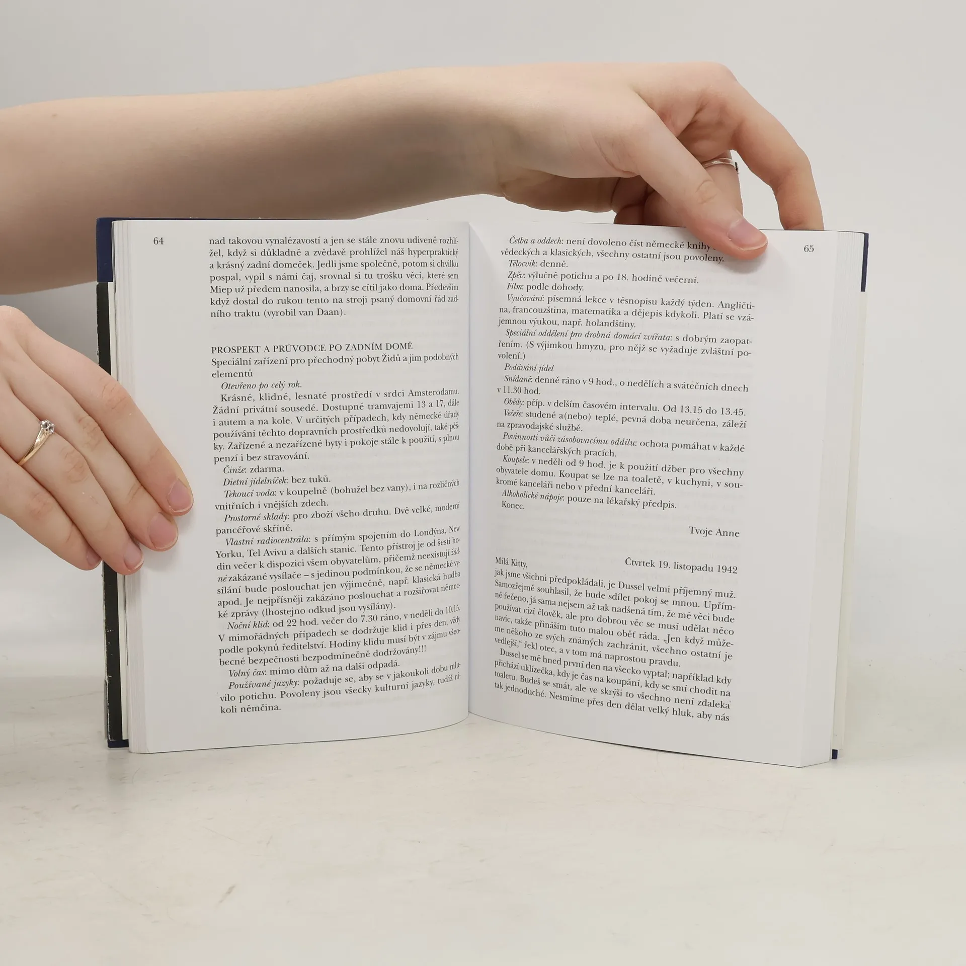 Dospívající Anne psala od 12. června 1942 do 4. srpna 1944 deník. Po prozrazení skrýše byla rodina odvezena do koncentračních táborů v Německu, přežil jen otec. Anne zahynula v Bergen-Belsenu. Po válce otec deník vydal, byl přeložen do mnoha jazyků a zdramatizován. Toto české vydání obsahuje poprvé nově nalezené a dosud nepublikované stránky.