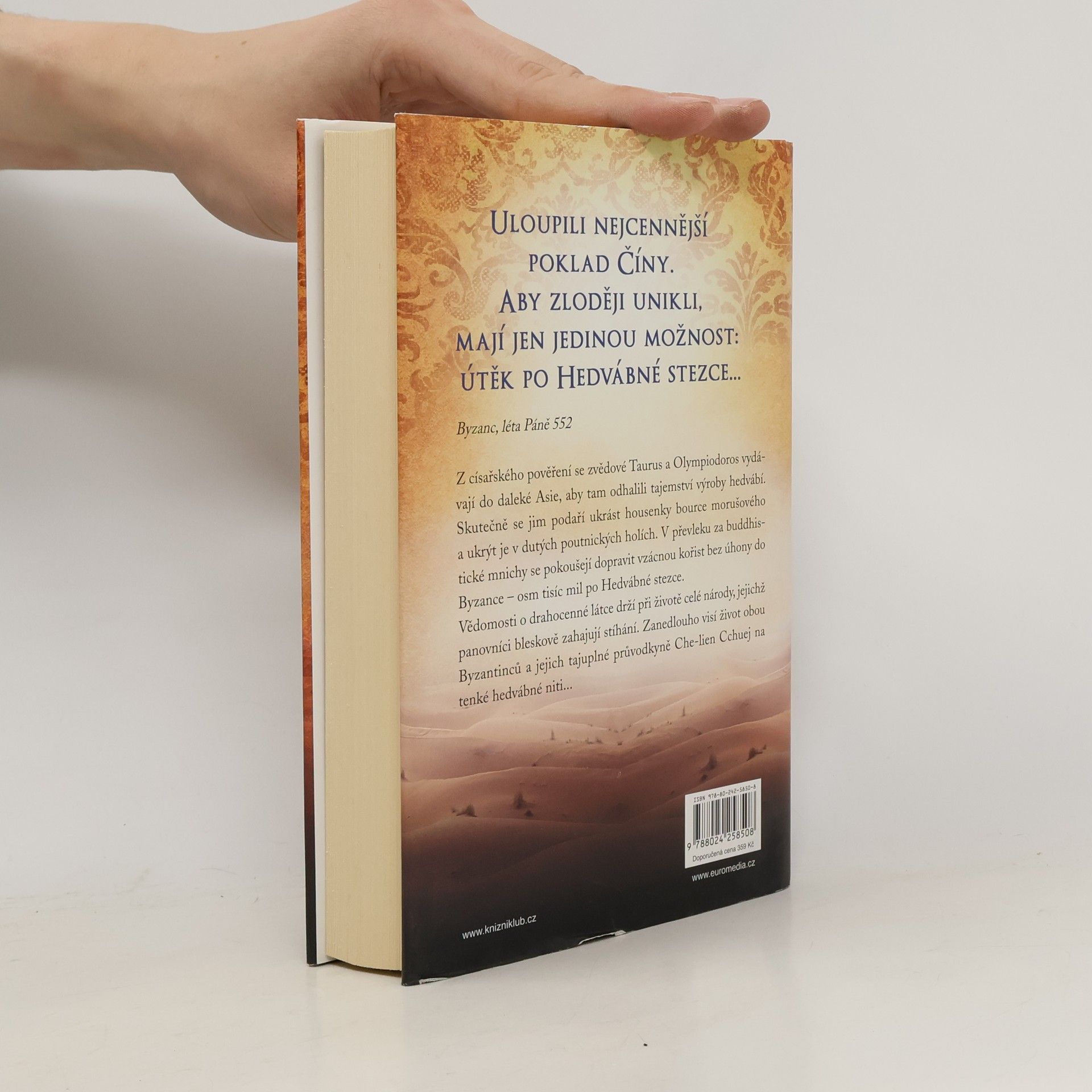 Byzanc, léta Páně 552 Z císařského pověření se zvědové Taurus a Olympiodoros vydávají do daleké Asie, aby tam odhalili tajemství výroby hedvábí. Skutečně se jim podaří ukrást housenky bource morušového a ukrýt je v dutých poutnických holích. V převleku za buddhistické mnichy se pokoušejí dopravit vzácnou kořist bez úhony do Byzance – osm tisíc mil po Hedvábné stezce. Vědomosti o drahocenné látce drží při životě celé národy, jejichž panovníci bleskově zahajují stíhání. Zanedlouho visí život obou Byzantinců a jejich tajuplné průvodkyně Che-lien Cchuej na hedvábné niti...