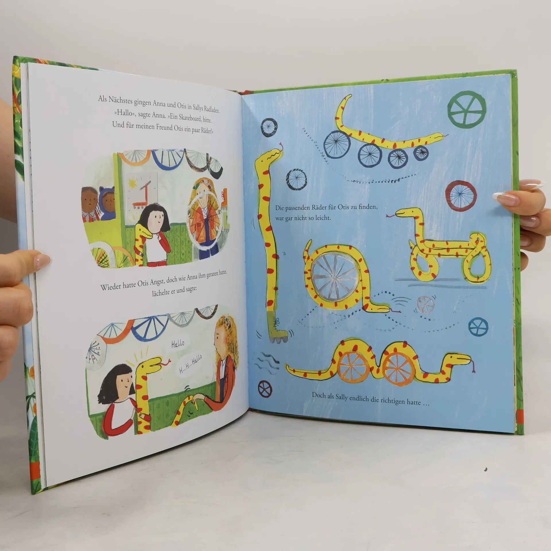 Da sie die Menschen nicht erschrecken wollen, bleiben Anna und ihr bester Freund Otis, eine Schlange, lieber im heimischen Garten. Dort haben sie viel Spass zusammen, z.B. im Planschbecken oder im Zelt mit Büchern. Doch "eines faulen Nachmittags" findet Anna, sie sollten auch die Stadt erkunden. Die Leute reagieren zuerst ablehnend und ängstlich. Otis hat zwar selbst grosse Angst, will aber seine Freundin nicht enttäuschen. Also beherzigt er Annas Rat, lächelt beim nächsten Mal freundlich und sagt "Hallo" zum Friseur, der ihm nun sogar den Kopf schamponiert. Es spricht sich schnell herum, dass sich vor Otis niemand zu fürchten braucht. So finden die beiden viele neue Freunde. Von der britischen Illustratorin wurde hierzulande noch nichts veröffentlicht. Mit ihren Bildern zu "The Happy Prince" von Oscar Wilde war Shearring aber schon in Bologna vertreten. Hier erzählt sie in fantasievollen und farbenfrohen Bildern von der Überwindung der Angst vor dem Fremden, was letztendlich das Leben bereichert. Ein Interview mit der Künstlerin beim Malen und ihre Bilder kann man im Netz finden. Sehr zu empfehlen! Ab 4