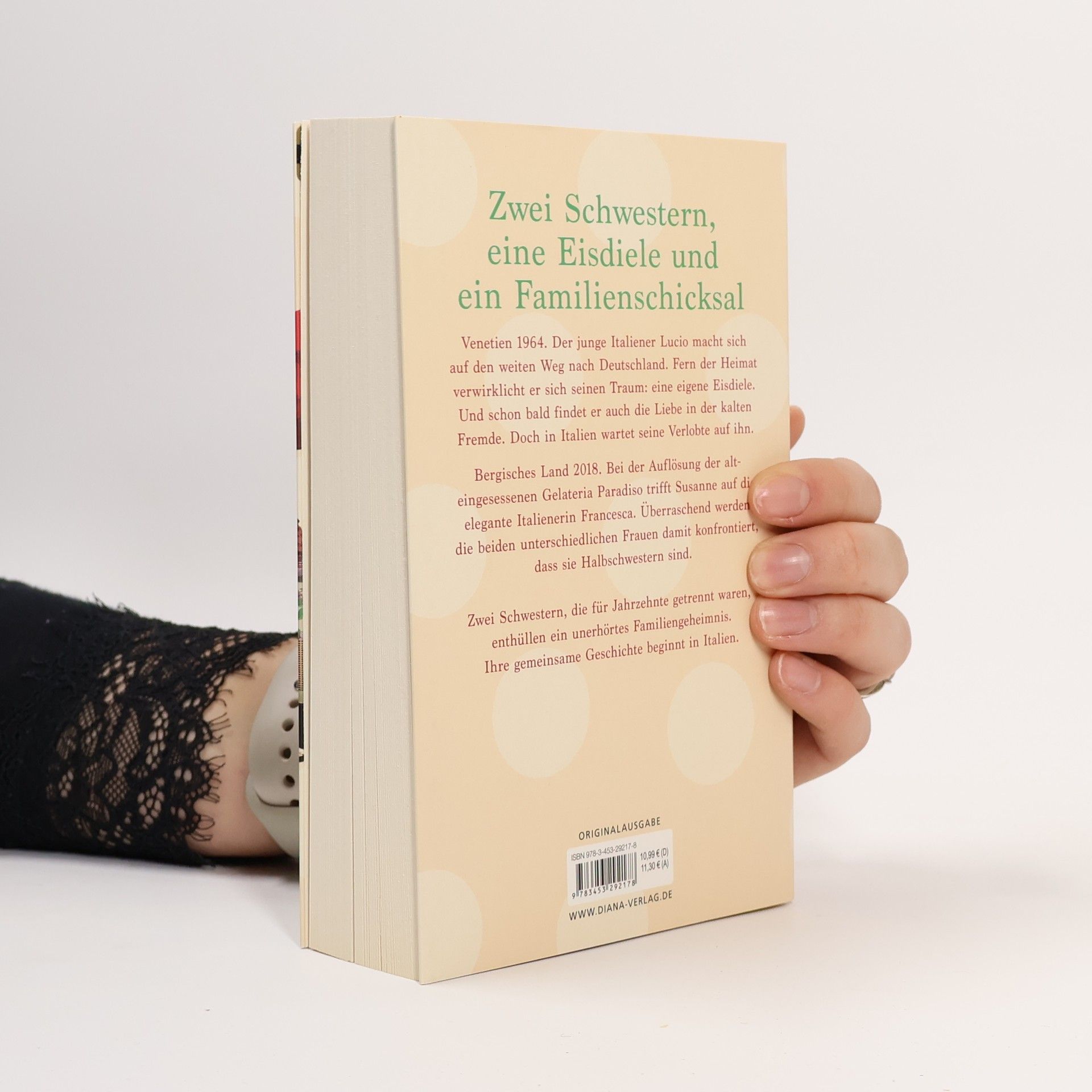 Venezien, 1964: Der junge Italiener Lucio macht sich auf den weiten Weg nach Deutschland. Fern der Heimat verwirklicht er sich seinen Traum: eine eigene Eisdiele. Und schon bald findet er auch die Liebe in der kalten Fremde. Doch in Italien wartet seine Verlobte auf ihn. Bergisches Land, 2018: Bei der Auflösung der alteingesessenen Gelateria Paradiso trifft Susanne auf die elegante Italienerin Francesca. Überraschend werden die beiden so unterschiedlichen Frauen damit konfrontiert, dass sie Halbschwestern sind. Zwei Schwestern, die für Jahrzehnte getrennt waren, decken das Geheimnis ihres Vaters auf. Ihre gemeinsame Geschichte beginnt in Italien.