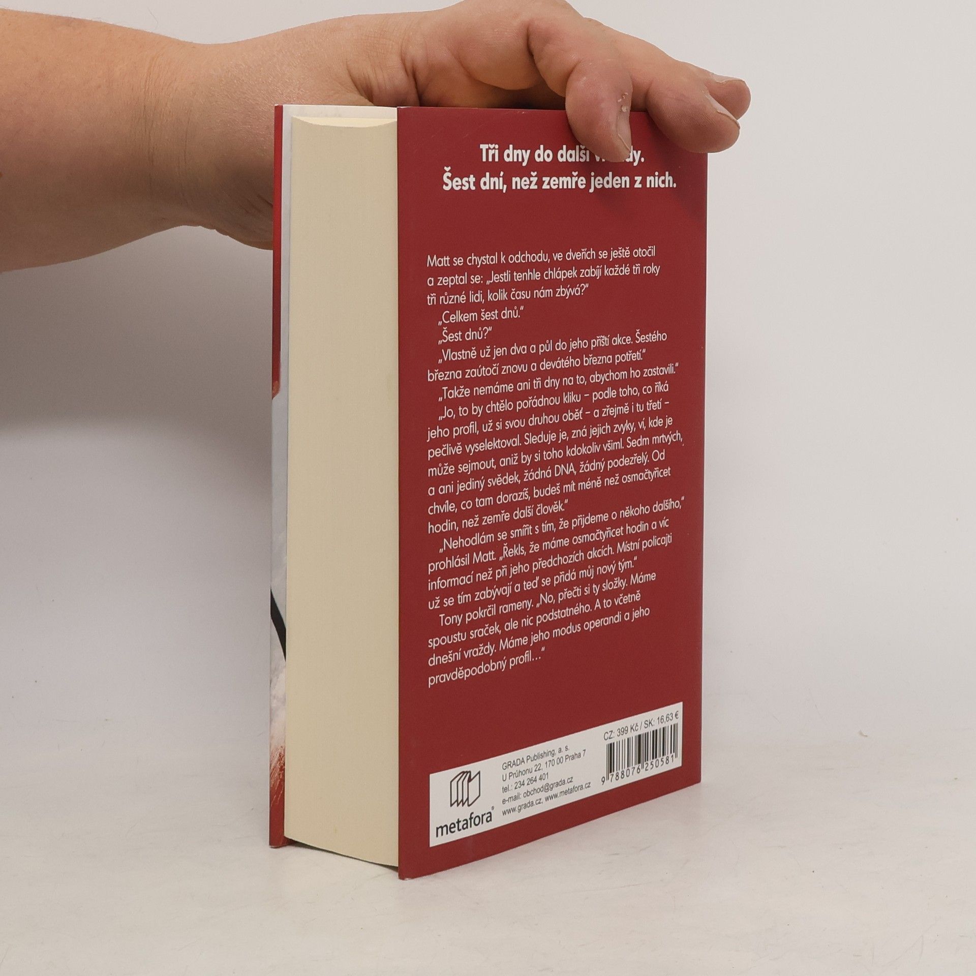 Tři dny do další vraždy. Šest dní, než zemře jeden z nich. Když policistka Kara Quinnová náhodou objeví tělo mladé ženy, spouští se tím vlna chaosu a paranoie. Způsob vraždy totiž ukazuje na dokonale kontrolovaný vztek psychopata a profil zločince odpovídá tzv. Trojkovému vrahovi, sériovému zabijákovi, který za sebou nechává vždy tři oběti v rozestupu tří dnů, než na tři roky zmizí. A mrtvá z Liberty Lake značí start nového cyklu. K případu je přidělena nově vzniklá mobilní vyšetřovací jednotka, založená agentem FBI Mattem Costou pro operace v odlehlých oblastech bez dostatečného pokrytí policejními složkami. Přestože ale speciální tým posílený Karou dělá, co může, vyšetřování neprobíhá zrovna hladce. Nemají svědky, nemají důkazy, ale ze všeho nejvíc – nemají čas. Nejenže do další očekávané vraždy zbývají necelé tři dny, ale pokud se Kaře a Mattovi Trojkového vraha nepodaří zastavit, za další tři bude na řadě policista – dost možná jeden z nich. První díl nové detektivní série.