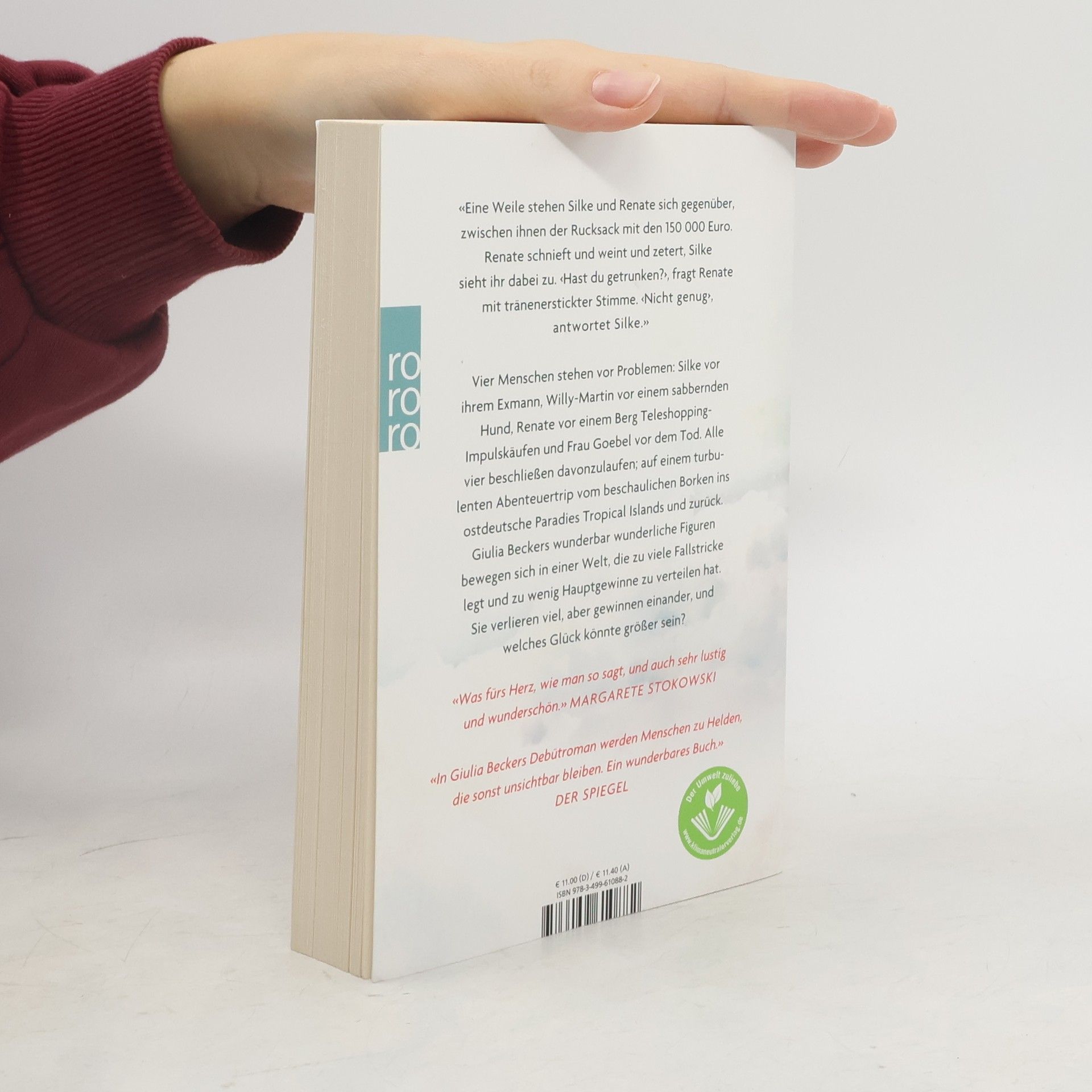 Giulia Becker, Autorin beim Neo Magazin Royal, erzählt in ihrem Debütroman eine grandiose Geschichte voller Wärme und Humor, mit wunderbar wundersamen Charakteren. Vier Menschen stehen vor Problemen: Silke vor ihrem Exmann, Willy-Martin vor einem sabbernden Hund, Renate vor einem Berg Teleshopping-Impulskäufen und Frau Goebel vor dem Tod. Alle vier beschließen davonzulaufen; auf einem turbulenten Abenteuertrip vom beschaulichen Borken ins ostdeutsche Paradies Tropical Islands und zurück. Giulia Beckers Figuren bewegen sich in einer Welt, die zu viele Fallstricke legt und zu wenig Hauptgewinne zu verteilen hat. Sie verlieren viel, aber gewinnen einander, und welches Glück könnte größer sein? Ausgezeichnet mit dem Debütpreis der lit. Cologne 2019!
