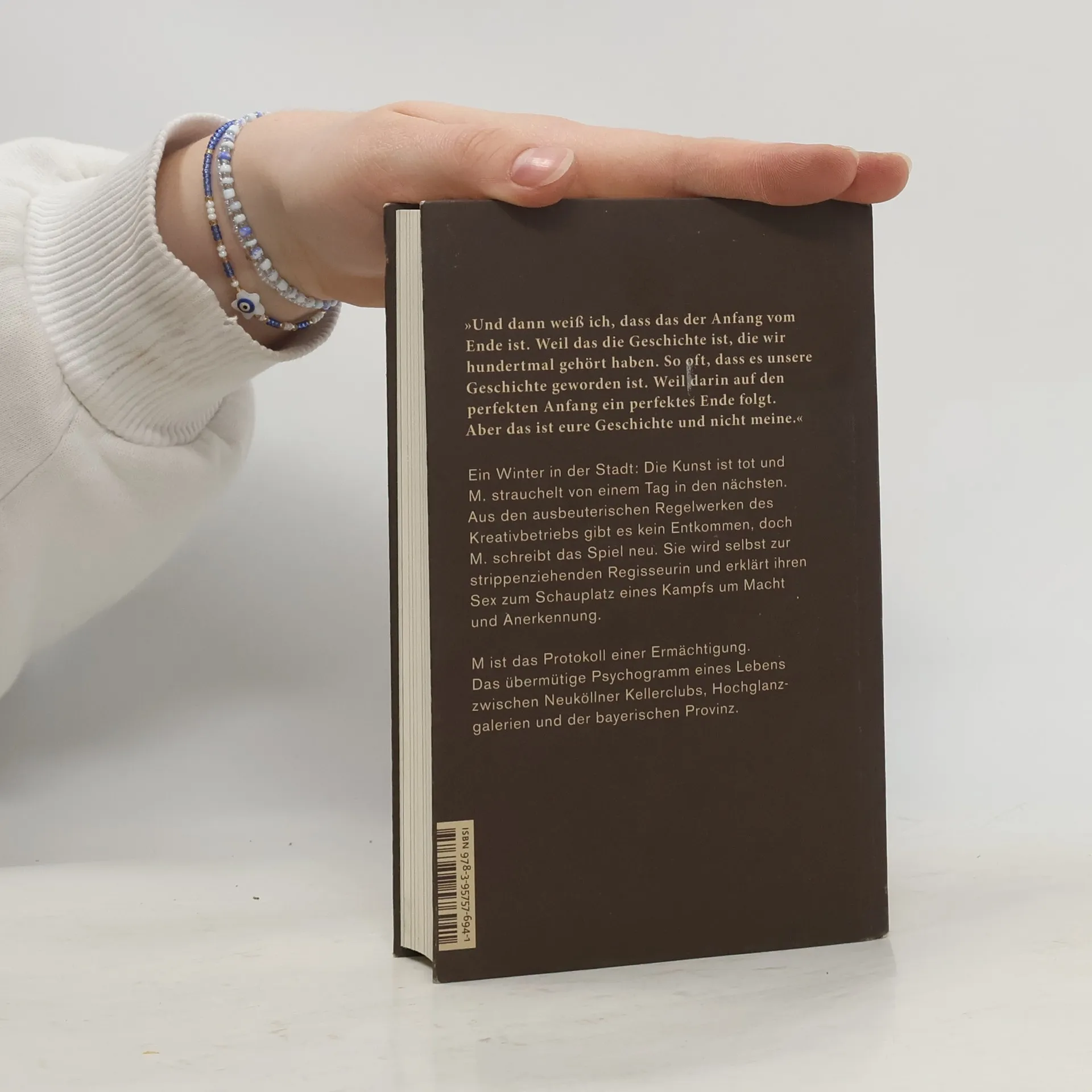Hier scheppert der DJ-Rollkoffer unerbittlich über Berliner Kopfsteinpflaster, schweißnasse Schaumstoffmatratzen treiben in ranzigen, beatdurchwummerten Kellern am Leser vorbei; eine von Erektionen umstellte Fitnessradtour im Kreuzberger Zimmer hilft das Speed abzubauen. Die Wände des Darkrooms kleben, Galeristen gieren nach frischem Fleisch und Plastikschwänzen. M. liefert sich aus und reißt die Macht an sich, sie fickt die Kunstszene, während sie für ihre nächste Ausstellung Gelnageldesignerinnen und Massagestühle auftreibt. M. ist das Protokoll einer Ermächtigung des eigenen Körpers, des eigenen Begehrens, und kalter Bericht über das Ausbeutungsgefüge im Kunstbetrieb - in einer Sprache, die schonungslos die Entwicklung der Erzählerin von einer zynischen Beobachterin zur strippenziehenden Regisseurin vollzieht.
