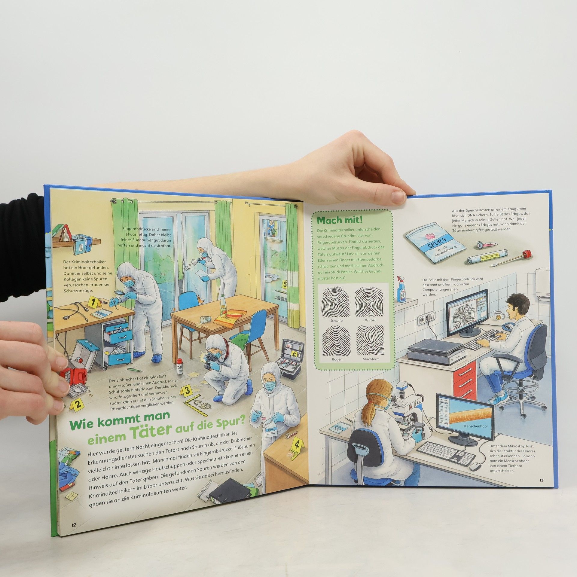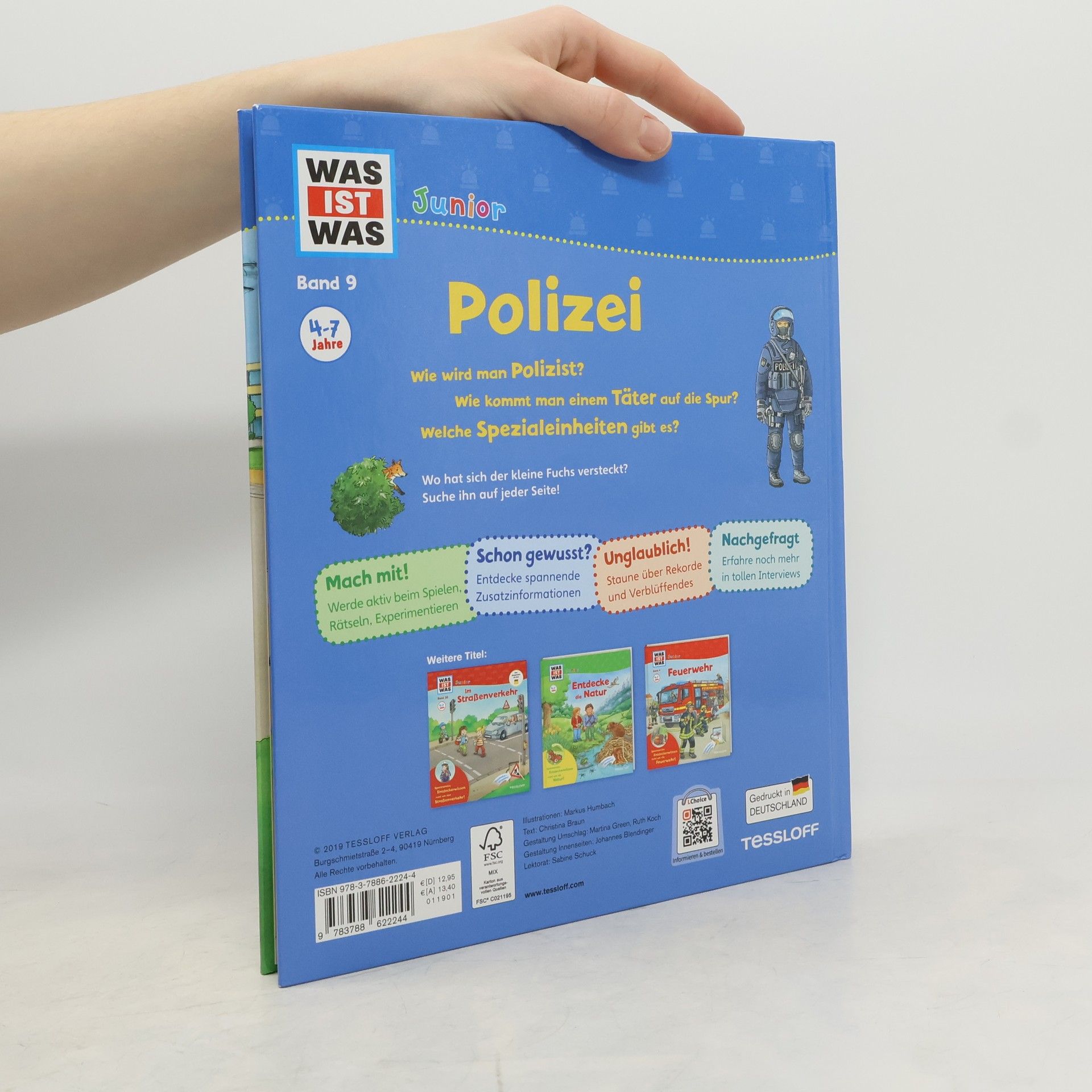 Polizisten „auf Streife“ kennt jedes Kind, genau wie die schnellen Polizeiautos, die mit Blaulicht und Sirene sogar über rote Ampeln fahren dürfen. Neben diesen bekannten Tätigkeitsfeldern der Polizei zeigt dieser Band Kindern ab 4 Jahren aber auch, welche weiteren Aufgaben die Polizei hat, wie es auf der Polizeiwache aussieht und wo sogenannte „Spezialeinheiten“ gebraucht werden. Nach und nach können die kleinen Entdecker mit Hilfe der zahlreichen Klappen immer tiefer ins Geschehen eintauchen. Ein Buch zu einem der absoluten Kinder-Lieblingsthemen, das ganz bestimmt immer wieder gerne zur Hand genommen wird!
