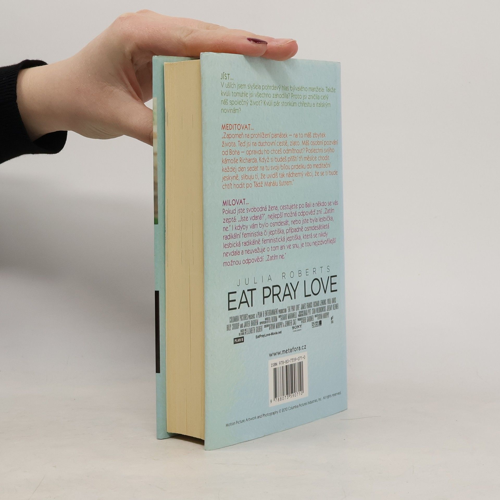 Kdyby šlo dát dvě a půl hvězdy, tak bych dala dvě a půl. Ze všech tří příběhů mě nejvíce bavila Indonésie, protože tam se konečně něco děje. Konečně už totiž Liz nemluvila jen o bohu a o tom jak je nešťastná a osamělá. Konečně si začínala užívat života a to mě bavilo. Chápu, že k tomu nejdřív musela postupně dojít a nebýt její pouti za sebepoznáním a za poznáním boha, tak by k tomu asi nedošla, ale na můj vkus si až moc na všechno stěžovala. A to mě nebavilo. Neustále omílala své problémy dokola. Je tam pár myšlenek, které se mi líbily a nad kterými jsem se pozastavila a zamyslela se. Ale tady musím říct, že film je daleko lepší.