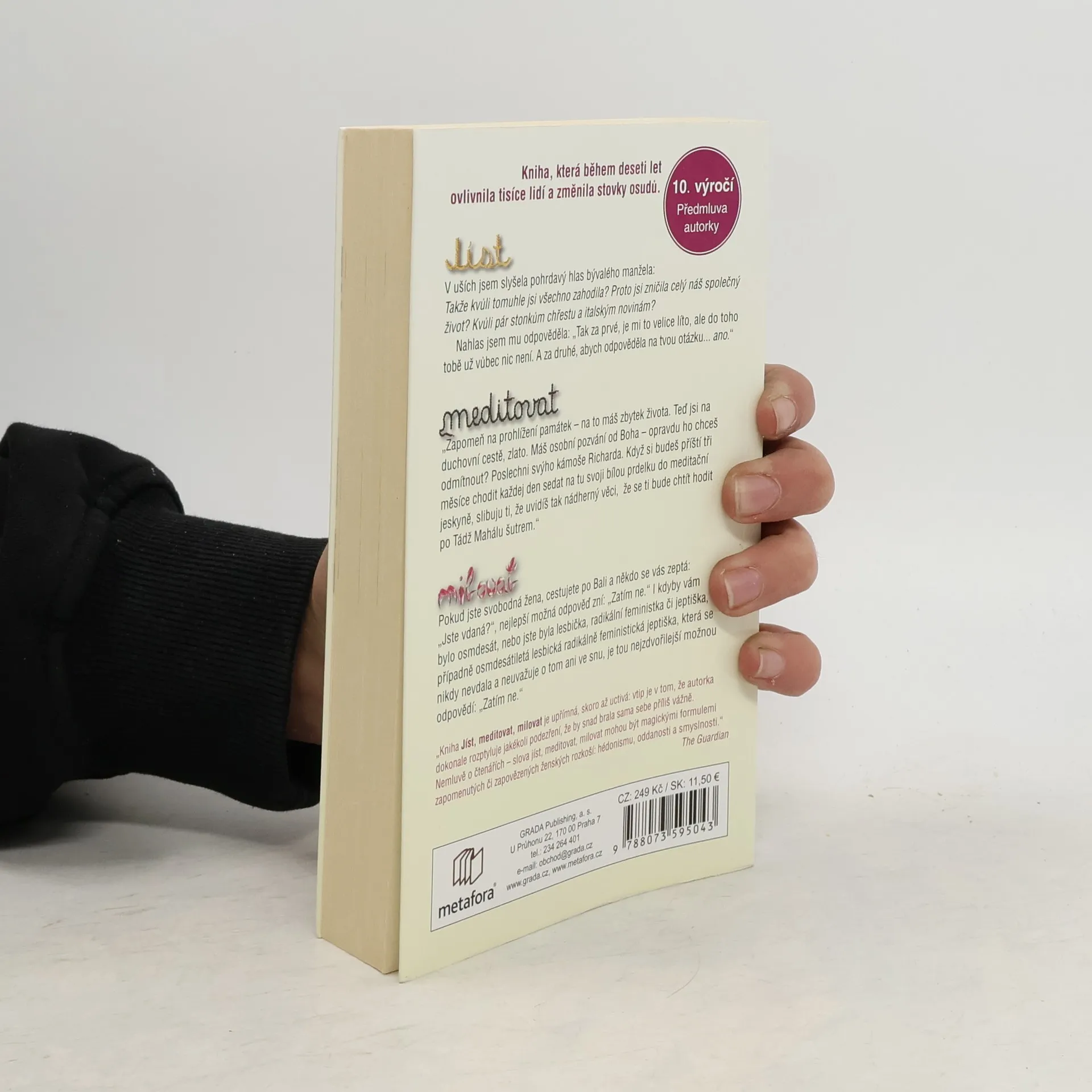 NOVĚ K 10. VÝROČÍ PRVNÍHO VYDÁNÍ. Pouť mladé dámy za pozemskými i duchovními rozkošemi napříč Itálií, Indií a Indonésií... Nové, doplněné vydání knižního (a filmového) bestselleru. Elizabeth má vše, co se od moderní Američanky očekává: manžela, dům a úspěšnou kariéru. Jenže místo aby se cítila šťastná, pohlcuje ji panika, zoufalství a zmatek. Odhodlá se tedy k radikálnímu kroku. Úplně sama se vydá na roční pouť kolem světa. V Itálii studuje umění rozkoše, flirtuje, nezřízeně hoduje a přibere deset nejšťastnějších kilogramů svého života. V Indii absolvuje čtyřměsíční duchovní cestu do vlastního nitra, na níž nechybí ani tak zdánlivé protiklady, jako je meditace, černý humor, mantry a vize. V Indonésii, kde se stane žačkou svérázného starého šamana, pak hledá svůj konečný cíl: rovnováhu a schopnost vybalancovat si život. JÍST... Kvůli pár stonkům chřestu a italským novinám jsi zničila náš společný život? MEDITOVAT... Uvidíš tak nádherný věci, že se ti bude chtít hodit po Tádž Mahálu šutrem. MILOVAT... Jste-li svobodná žena cestující po Bali, nejlepší odpověď na otázku „Jste vdaná?“, zní: „Zatím ne.“ Podle knihy vznikl rovněž úspěšný film s Julií Roberts v hlavní roli.