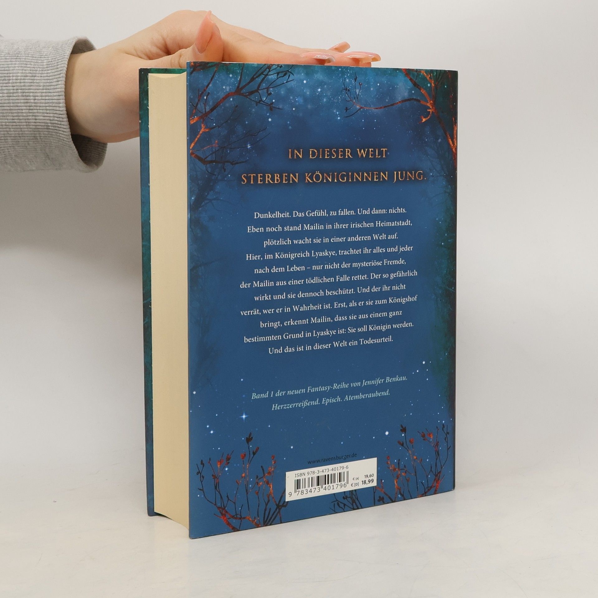 In dieser Welt sterben Königinnen jung. Dunkelheit. Das Gefühl, zu fallen. Und dann: nichts. Mailin wacht in einer anderen Welt auf, im Königreich Lyaskye, wo ihr Leben von allen bedroht wird – bis ein mysteriöser Fremder sie rettet. Er wirkt gefährlich, schützt sie jedoch. Als er sie zum Königshof bringt, erkennt Mailin, dass sie nicht ohne Grund in Lyaskye ist: Sie soll Königin werden, was in dieser Welt ein Todesurteil bedeutet. Band 1 der High-Romantasy-Reihe von SPIEGEL-Bestsellerautorin Jennifer Benkau ist herzzerreißend, episch und atemberaubend. Die Romantasy-Reihen „One True Queen“, „Das Reich der Schatten“ und „The Lost Crown“ spielen in derselben Fantasy-Welt, können aber unabhängig voneinander gelesen werden. Sie sind in folgender Reihenfolge erschienen: - One True Queen, Band 1: Von Sternen gekrönt - One True Queen, Band 2: Aus Schatten geschmiedet - Das Reich der Schatten, Band 1: Her Wish So Dark - Das Reich der Schatten, Band 2: His Curse So Wild - The Lost Crown, Band 1: Wer die Nacht malt - The Lost Crown, Band 2: Wer das Schicksal zeichnet Zusätzlich gibt es New-Adult-Romance von Jennifer Benkau: - A Reason To Stay (Liverpool-Reihe 1) - A Reason To Hope (Liverpool-Reihe 2)
