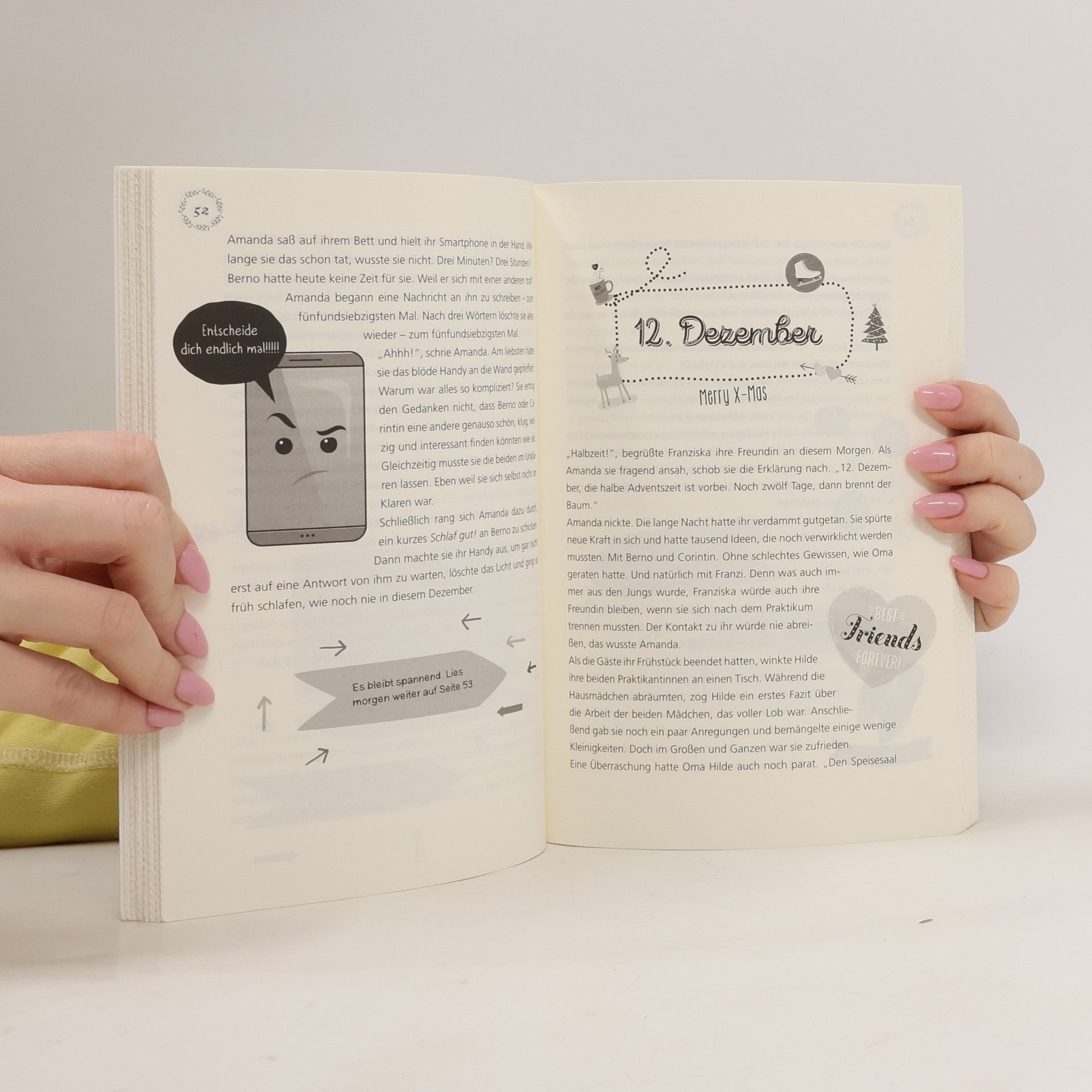 Adventskalender der 1000 Gefahren Ein aufregendes Praktikum liegt vor Amanda: Vier Wochen wird sie im Chalet Noblesse aushelfen, einem wahren Märchenschloss für die reichen Skigäste der Schweizer Alpen! Dort lernt sie Berno kennen, der nicht nur unglaublich nett ist, sondern auch noch Lawinenhunde ausbildet. Amanda ist hin und weg! Vor ihr liegt eine Zeit voller romantischer Ballonfahrten, rasanter Snowboard-Abfahrten und einem zauberhaften Weihnachtsball ... Ein zauberhafter Adventskalender mit auftrennbaren Seiten und vielen Entscheidungsmöglichkeiten für Mädchen ab 10 Jahre! Du denkst, das hier sei ein ganz normales Buch? Falsch! Denn du allein hast in der Hand, wie das Abenteuer ausgeht. Aber nimm dich in acht: Wenn du dich falsch entscheidest, begibst du dich in große Gefahr! Entdecke auch diese spannenden Abenteuer der „1000 Gefahren“-Reihe: Das Handy der 1000 Gefahren 1000 Gefahren für den Bodyguard Der Avatar der 1000 Gefahren Der Schulbus der 1000 Gefahren Die Drohne der 1000 Gefahren 1000 Gefahren. Hier entscheidest du, wie die Geschichte weitergeht!