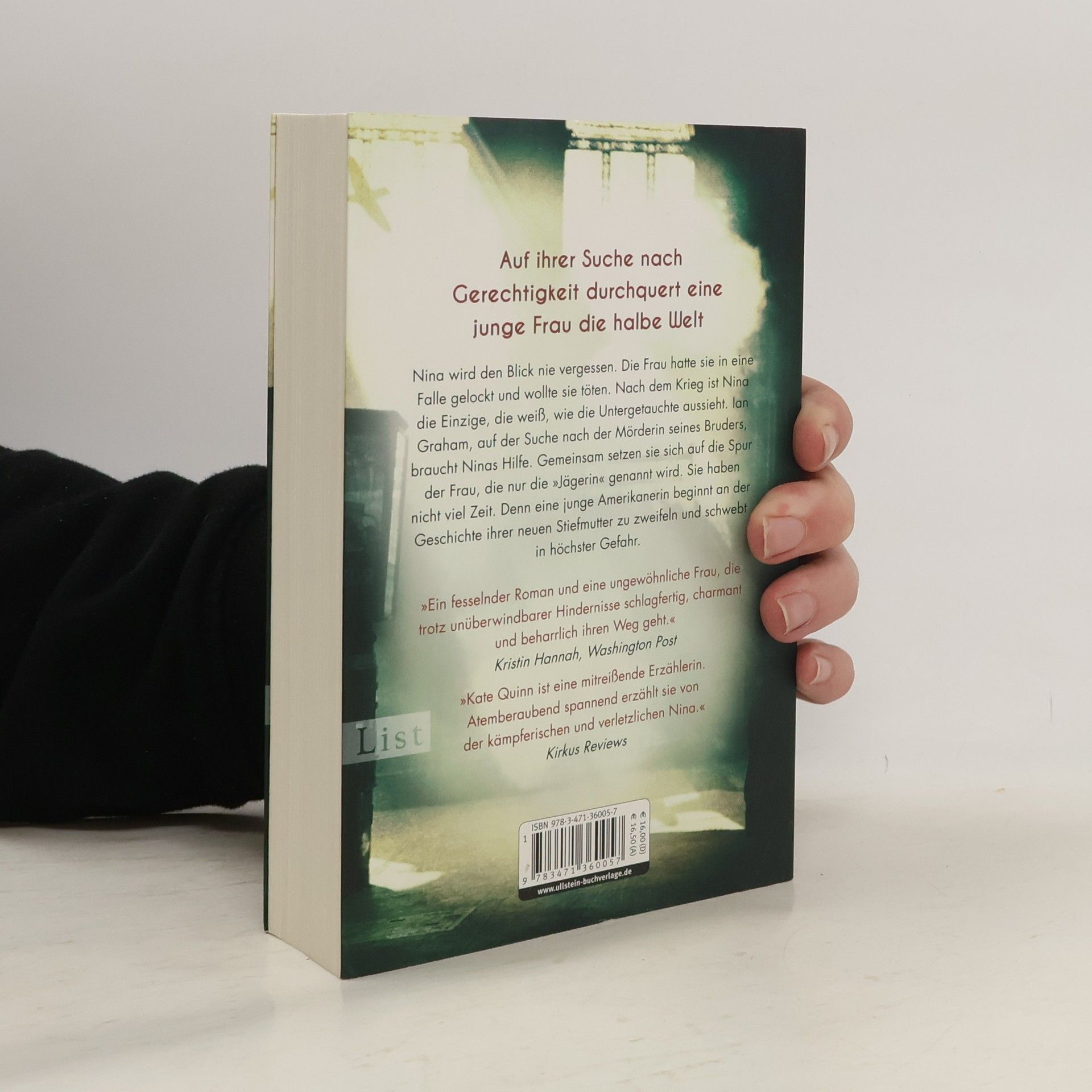 Auf ihrer Suche nach Gerechtigkeit durchquert eine junge Frau die halbe Welt Nina wird den Blick nie vergessen. Die Frau hatte sie in eine Falle gelockt und wollte sie töten. Nach dem Krieg ist Nina die Einzige, die weiß, wie die Untergetauchte aussieht. Ian Graham, auf der Suche nach der Mörderin seines Bruders, braucht Ninas Hilfe. Gemeinsam setzen sie sich auf die Spur der Frau, die nur die „Jägerin“ genannt wird. Sie haben nicht viel Zeit. Denn eine junge Amerikanerin beginnt an der Geschichte ihrer neuen Stiefmutter zu zweifeln und schwebt in höchster Gefahr. Inspiriert von wahren historischen Ereignissen verbindet Kate Quinn große Weltgeschichte mit einer hinreißenden Liebesgeschichte. „Ein fesselnder Roman und eine ungewöhnliche Frau, die trotz unüberwindbarer Hindernisse schlagfertig, charmant und beharrlich ihren Weg geht.“ Kristin Hannah, Washington Post „Kate Quinn ist eine mitreißende Erzählerin. Atemberaubend spannend erzählt sie von der kämpferischen und verletzlichen Nina.“ Kirkus Reviews