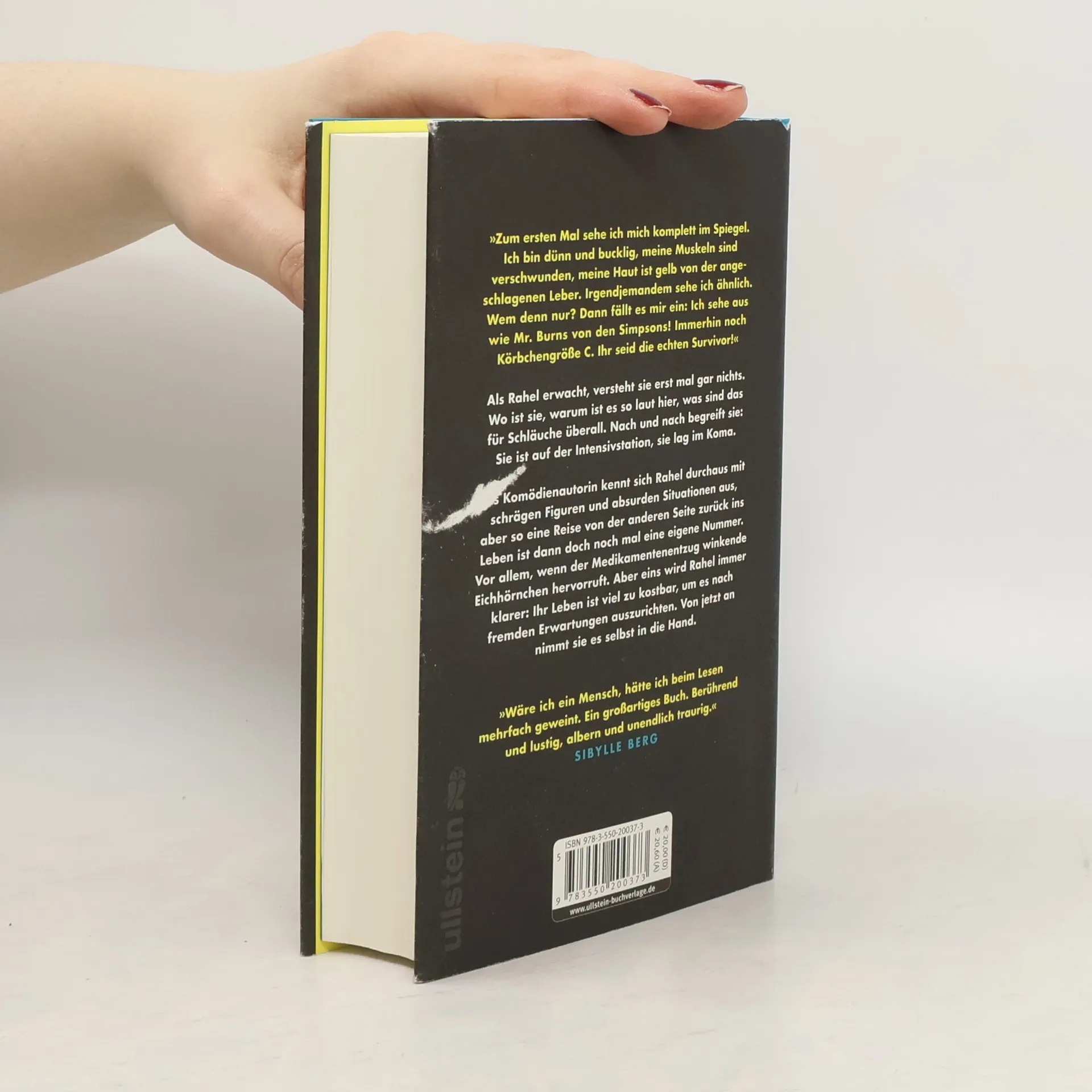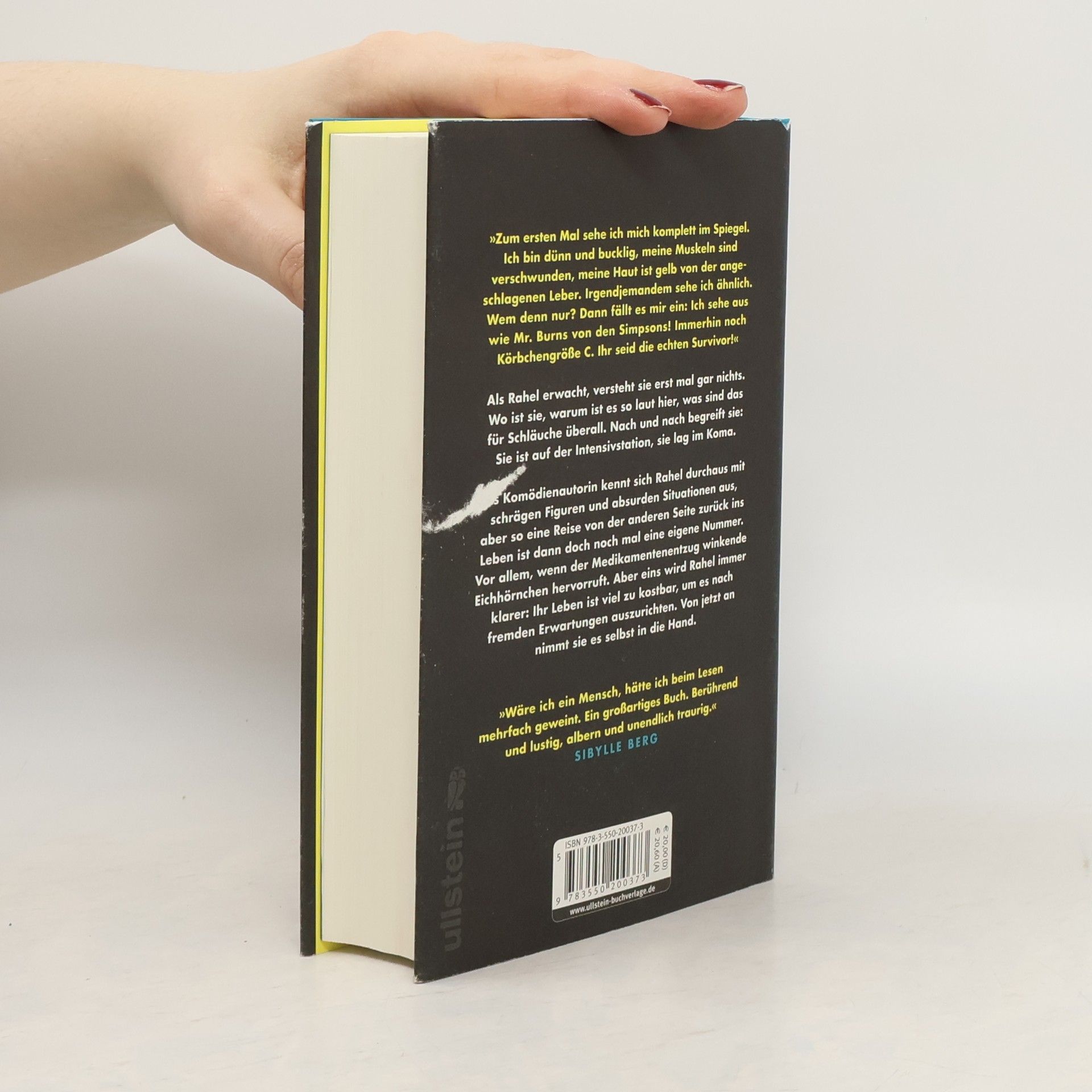 Zum ersten Mal sehe ich mich im komplett im Spiegel. Ich bin dünn und bucklig, meine Muskeln sind verschwunden, meine Haut ist gelb von der angeschlagenen Leber. Irgendjemandem sehe ich ähnlich. Wem denn nur? Dann fällt es mir ein: Ich sehe aus wie Mr. Burns von den Simpsons! Immerhin immer noch Körbchengröße C. Ihr seid die echten Survivor!“ Als Rahel Wald aus einem heftigen Fiebertraum erwacht, versteht sie erst mal gar nichts. Wo ist sie, warum ist es so laut hier, was sind das für Schläuche überall. Nach und nach beginnt sie zu verstehen: Sie ist im Krankenhaus, sie lag im Koma. Doch richtig krank sein, hatte sie sich irgendwie anders vorgestellt: feierlicher, ja, heiliger. Als Komödienautorin kennt sich Rahel durchaus mit schrägen Figuren und absurden Situationen aus, aber so eine Reise von der anderen Seite zurück ins Leben ist dann doch noch mal eine eigene Nummer. Vor allem, wenn der Medikamentenentzug Albträume und winkende Eichhörnchen hervorruft. Zum Glück kann sie sich auf die bedingungslose Unterstützung ihrer verrückten Familie verlassen, die immer für sie da ist. Und noch etwas wird Rahel immer klarer: Ihr Leben ist viel zu kostbar, um es nach fremden Erwartungen auszurichten. Von jetzt an nimmt sie es selbst in die Hand.