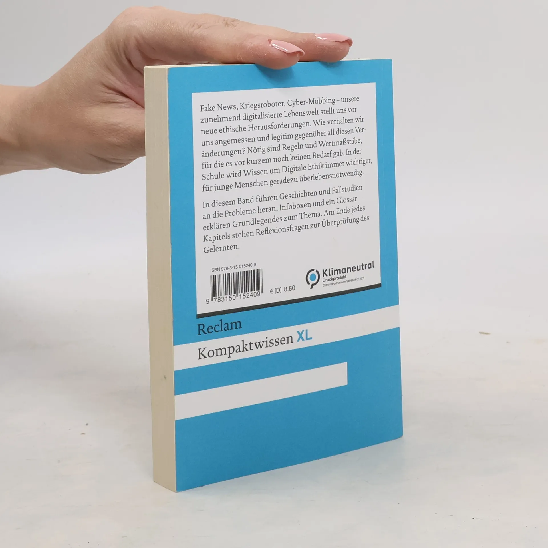 Fake News, Kriegsroboter, Cyber-Mobbing – unsere zunehmend digitalisierte Lebenswelt stellt uns vor neue ethische Herausforderungen. Wie verhalten wir uns angemessen und legitim gegenüber all diesen Veränderungen? Nötig sind Regeln und Wertmaßstäbe, für die es vor kurzem noch keinen Bedarf gab. In der Schule wird Wissen um Digitale Ethik immer wichtiger, für junge Menschen geradezu überlebensnotwendig. In diesem Band führen Geschichten und Fallstudien an die Probleme heran, Infoboxen und ein Glossar erklären Grundlegendes zum Thema. Am Ende jedes Kapitels stehen Reflexionsfragen zur Überprüfung des Gelernten. Kompaktwissen XL - Schülergerechte Darstellungen - Einprägsam und leicht verständlich - Zweifarbiges Innenlayout
