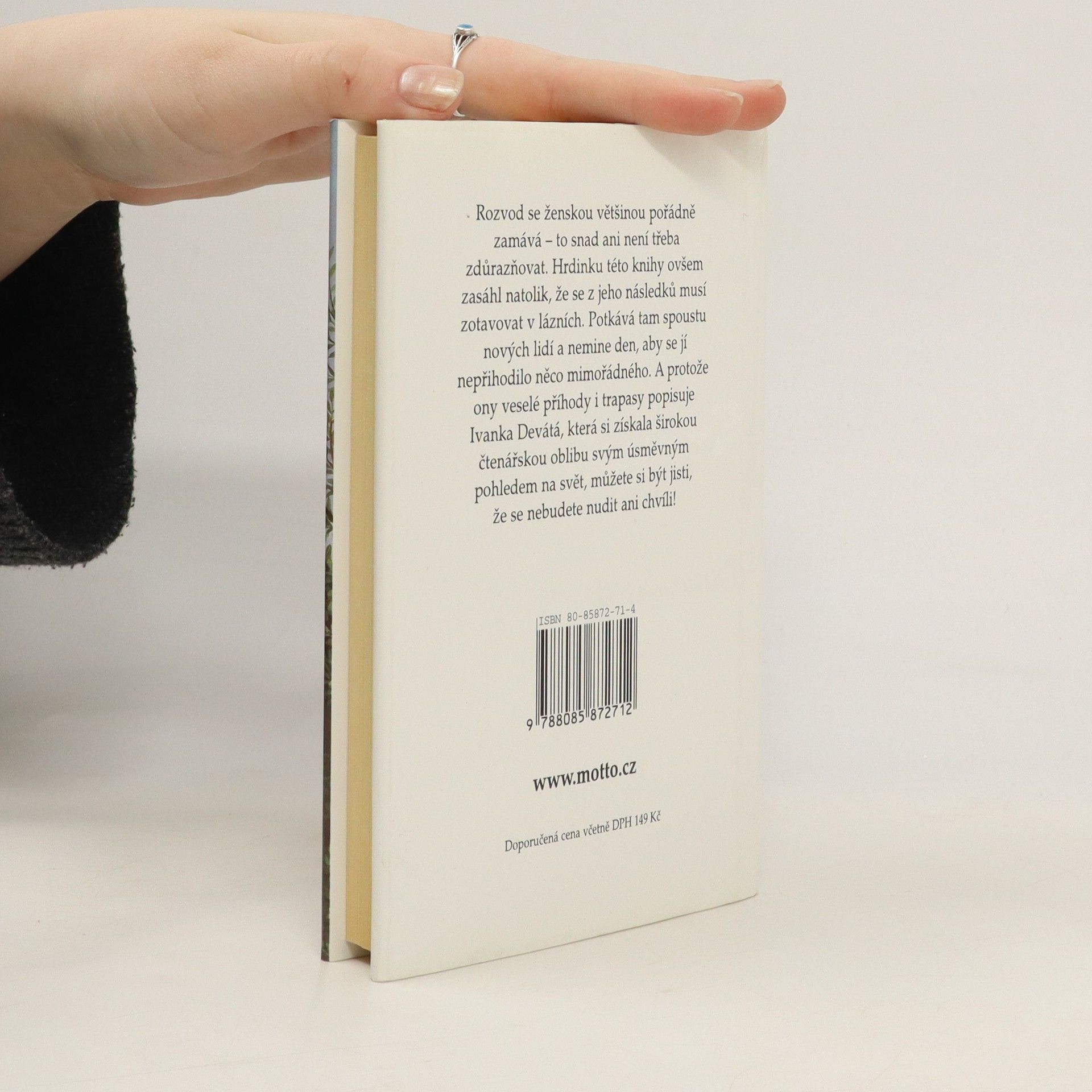 Rozvod se ženskou většinou pořádně zamává. Hrdinku této knihy ovšem zasáhl natolik, že se z jeho důsledků musí zotavovat v lázních. Potkává tam spoustu nových lidí a nemine den, aby se jí nepřihodilo něco mimořádného. A protože ony veselé příhody i trapasy popisuje Ivanka Devátá, která si získala širokou čtenářskou oblibu svým úsměvným pohledem na svět, můžete si být jisti, že se nebudete nudit ani chvíli.