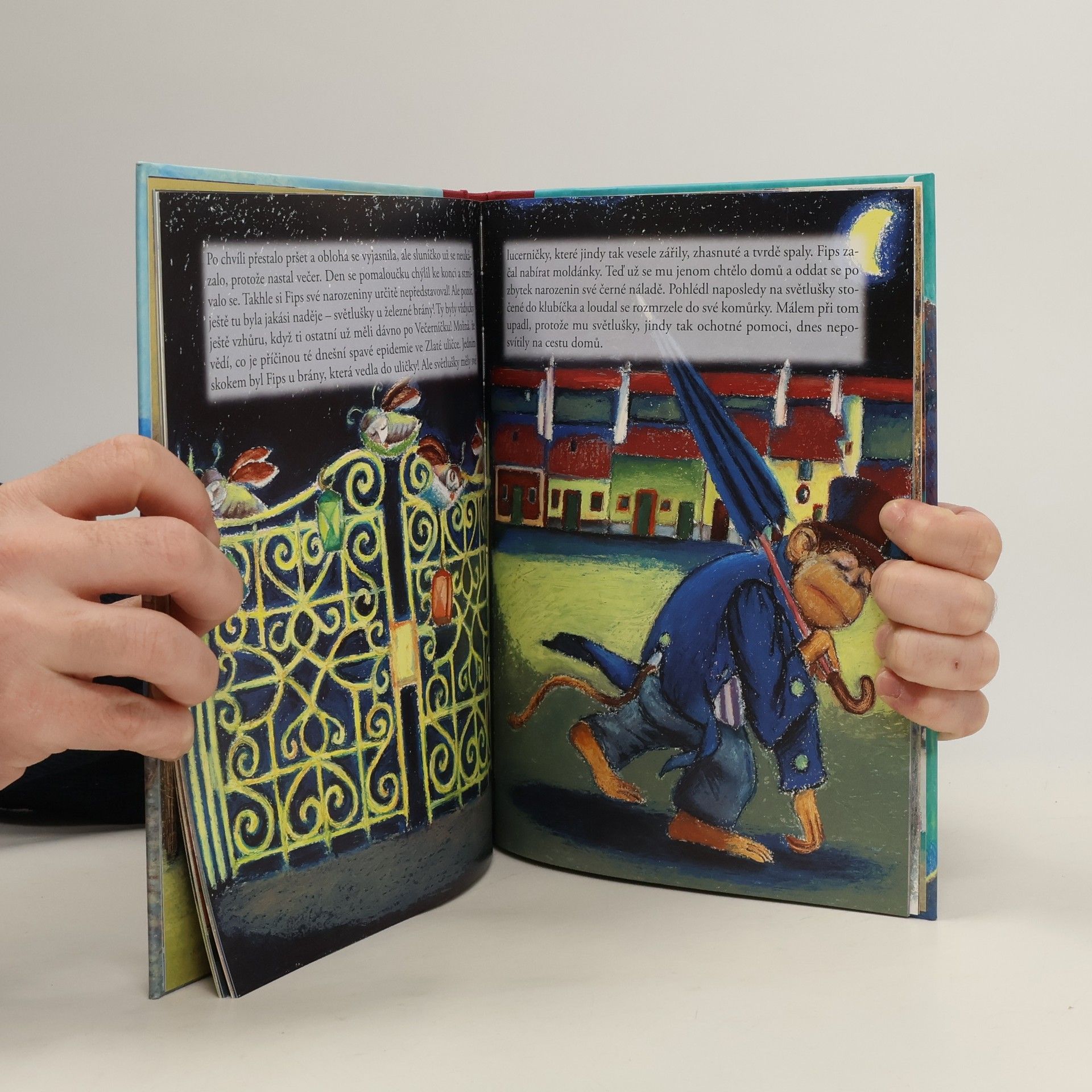 Das Goldene Gässchen in Prag. In seinen putzigen, bunten Häuschen haben früher vor allem einfache und arme Leute gewohnt. Vor vielen Jahrhunderten haben hier die Torschützen – die Wachen an den Burgtoren ihre Unterkunft gehabt. Vor etwa fünfzig Jahren verließen die letzten Bewohner das enge Goldene Gässchen. Unbewohnt ist die kleine Gasse jedoch nicht: In die von den Menschen verlassene Häuserzeile sind allerlei Tiere eingezogen – Kätzchen, Spatzen, Maikäfer, Glühwürmchen – und eben auch das Äffchen Fips, von dem diese Geschichte erzählt.
