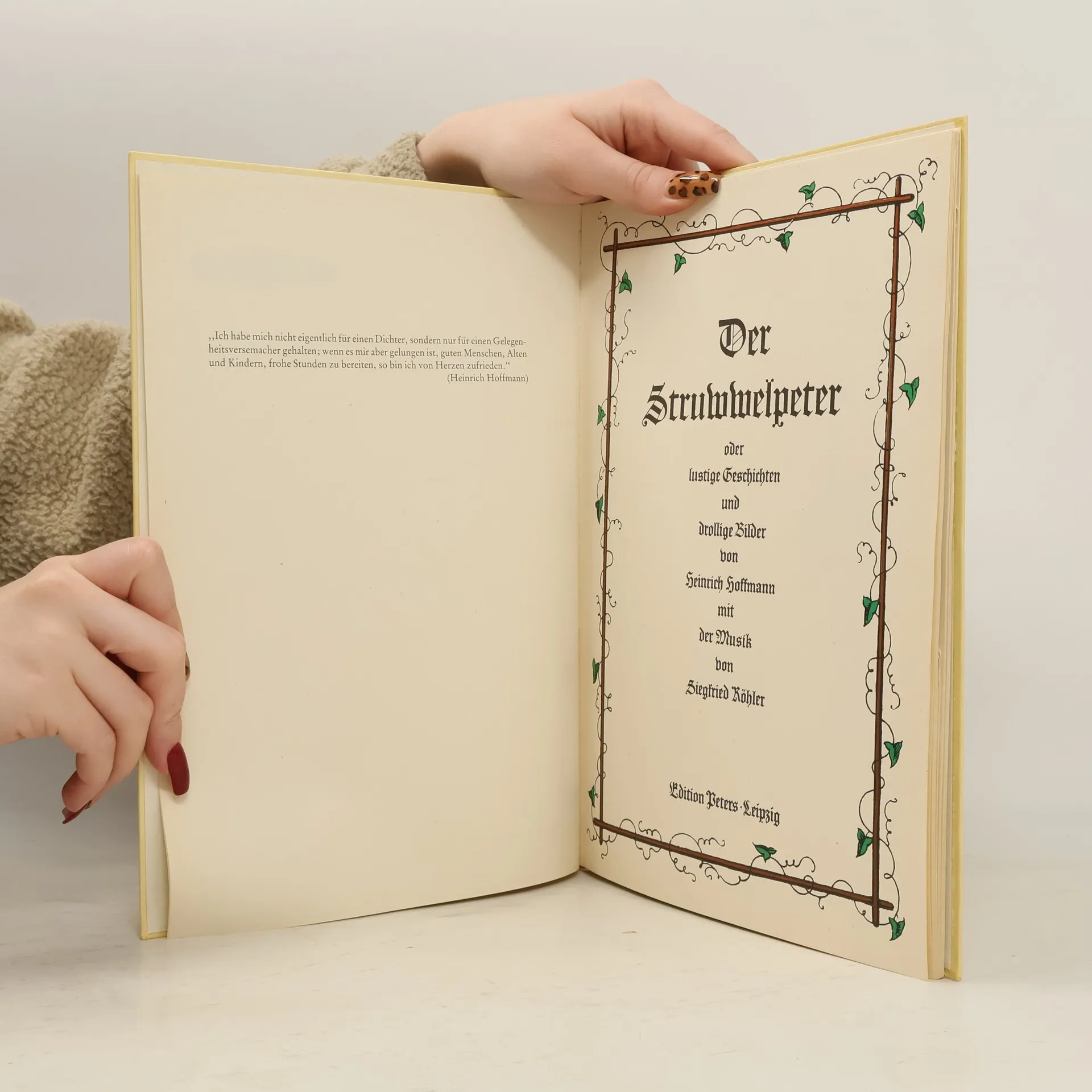 1844 suchte der Arzt Heinrich Hoffmann ein Bilderbuch als Weihnachtsgeschenk für seinen dreijährigen Sohn Carl, fand jedoch nichts Passendes. In der Zeitschrift „Gegen“ beschreibt Hoffmann, dass er lange Erzählungen oder moralische Geschichten vorfand, die nicht für Kinder in diesem Alter geeignet waren. Schließlich kehrte er mit einem leeren Schreibheft zurück und beschloss, ein eigenes Bilderbuch zu erstellen. Das Geschenk kam gut an und erregte das Interesse seiner erwachsenen Freunde, die ihn drängten, das Buch zu veröffentlichen. Zunächst lehnte er ab, doch ein befreundeter Verleger konnte ihn überzeugen. 1845 erschien das Buch erstmals unter dem Titel „Lustige Geschichten und drollige Bilder für Kinder von 3–6 Jahren“, ab der vierten Auflage 1847 als „Struwwelpeter“. Seit 1858 gab es veränderte Darstellungen. Hoffmann erzählte Geschichten über unartige Kinder, die nicht auf ihre Eltern hören und dafür bestraft werden, wie der „bitterböse Friederich“, der Tiere quält, oder Paulinchen, die mit Streichhölzern spielt. Auch positive Geschichten, wie die vom Hasen, der den Jäger überlistet, sind enthalten. Namen wie Zappelphilipp und Suppenkaspar sind in die deutsche Sprache eingegangen, und Textpassagen wie „Konrad“ sprach die Frau Mama, „ich geh aus und Du bleibst da“ sind heute allgemein bekannt.