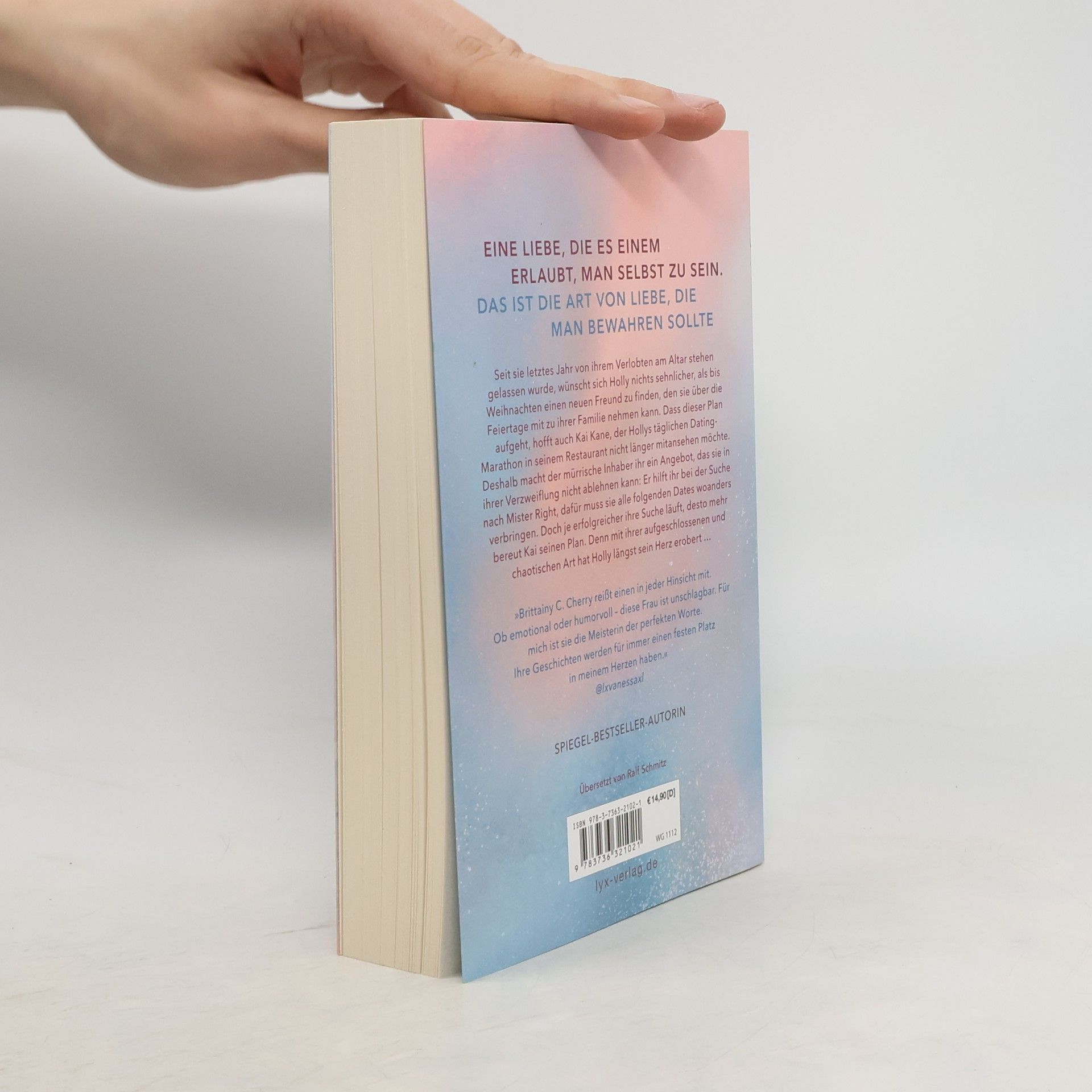Eine Liebe, die es einem erlaubt, man selbst zu sein. Das ist die Art von Liebe, die man bewahren sollte Seit sie letztes Jahr von ihrem Verlobten am Altar stehen gelassen wurde, wünscht sich Holly nichts sehnlicher, als bis Weihnachten einen neuen Freund zu finden, den sie über die Feiertage mit zu ihrer Familie nehmen kann. Dass dieser Plan aufgeht, hofft auch Kai Kane, der Hollys täglichen Dating-Marathon in seinem Restaurant nicht länger mitansehen möchte. Deshalb macht der mürrische Inhaber ihr ein Angebot, das sie in ihrer Verzweiflung nicht ablehnen kann: Er hilft ihr bei der Suche nach Mister Right, dafür muss sie alle folgenden Dates woanders verbringen. Doch je erfolgreicher ihre Suche läuft, desto mehr bereut Kai seinen Plan. Denn mit ihrer aufgeschlossenen und chaotischen Art hat Holly längst sein Herz erobert ... »Brittainy C. Cherry reißt einen in jeder Hinsicht mit. Ob emotional oder humorvoll - diese Frau ist unschlagbar. Für mich ist sie die Meisterin der perfekten Worte. Ihre Geschichten werden für immer einen festen Platz in meinem Herzen haben.« @LXVANESSAXL Auftakt der neuen Reihe von SPIEGEL -Bestseller-Autorin Brittainy C. Cherry