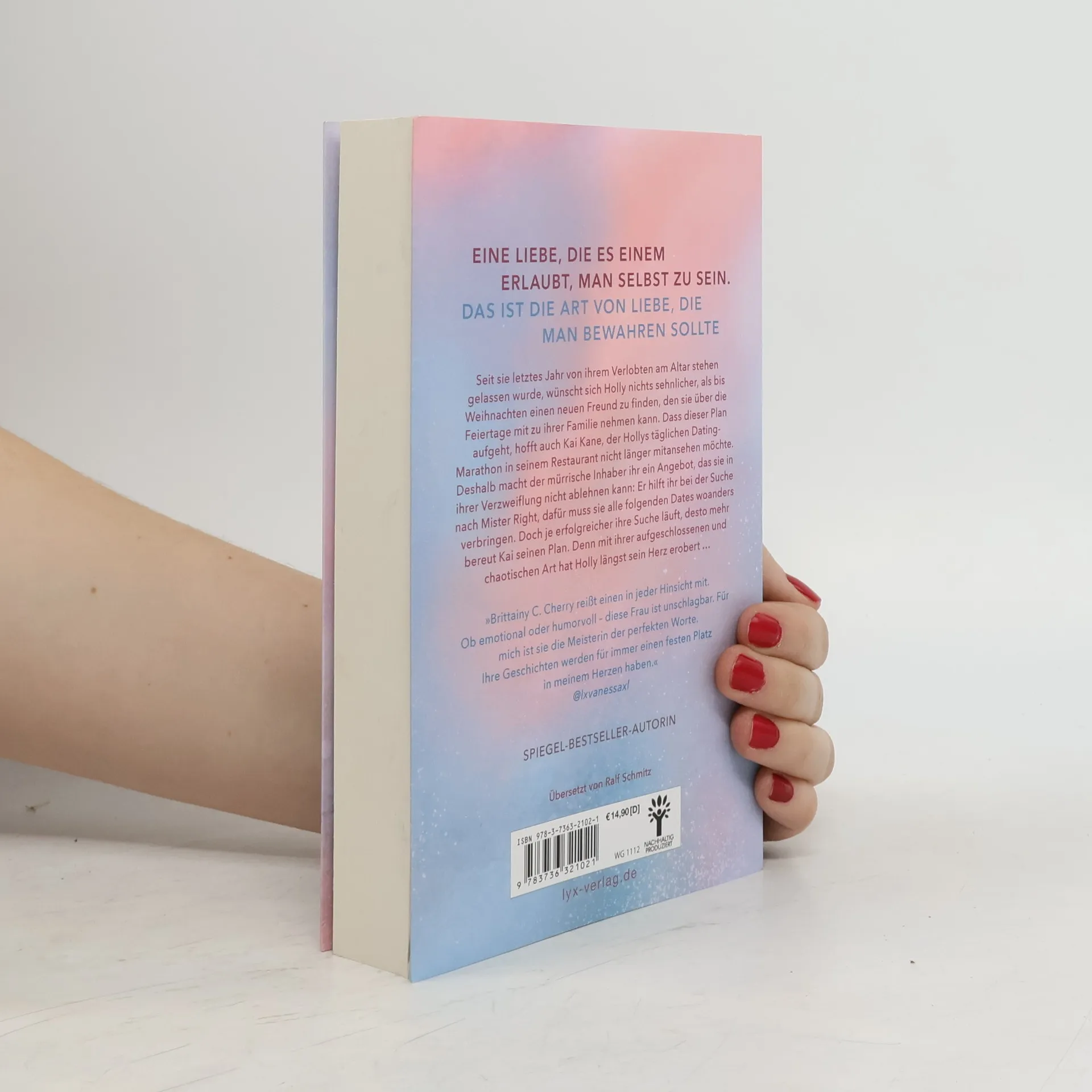 Eine Liebe, die es einem erlaubt, man selbst zu sein. Das ist die Art von Liebe, die man bewahren sollte Seit sie letztes Jahr von ihrem Verlobten am Altar stehen gelassen wurde, wünscht sich Holly nichts sehnlicher, als bis Weihnachten einen neuen Freund zu finden, den sie über die Feiertage mit zu ihrer Familie nehmen kann. Dass dieser Plan aufgeht, hofft auch Kai Kane, der Hollys täglichen Dating-Marathon in seinem Restaurant nicht länger mitansehen möchte. Deshalb macht der mürrische Inhaber ihr ein Angebot, das sie in ihrer Verzweiflung nicht ablehnen kann: Er hilft ihr bei der Suche nach Mister Right, dafür muss sie alle folgenden Dates woanders verbringen. Doch je erfolgreicher ihre Suche läuft, desto mehr bereut Kai seinen Plan. Denn mit ihrer aufgeschlossenen und chaotischen Art hat Holly längst sein Herz erobert ... »Brittainy C. Cherry reißt einen in jeder Hinsicht mit. Ob emotional oder humorvoll - diese Frau ist unschlagbar. Für mich ist sie die Meisterin der perfekten Worte. Ihre Geschichten werden für immer einen festen Platz in meinem Herzen haben.« @LXVANESSAXL Auftakt der neuen Reihe von SPIEGEL -Bestseller-Autorin Brittainy C. Cherry