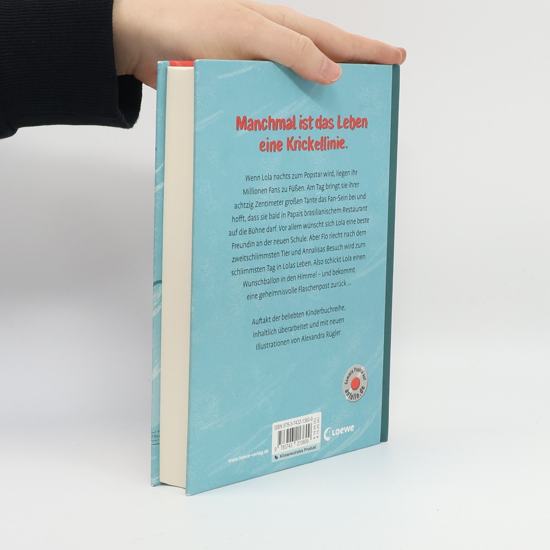 Das Buch ist bei deiner Buchhandlung vor Ort und bei vielen Online-Buchshops erhältlich! Manchmal ist das Leben eine Krickellinie Wenn Lola nachts zum Popstar wird, liegen ihr Millionen Fans zu Füßen. Am Tag bringt sie ihrer achtzig Zentimeter großen Tante das Fan-Sein bei und hofft, dass sie bald in Papais brasilianischem Restaurant auf die Bühne darf. Vor allem wünscht sich Lola eine beste Freundin an der neuen Schule. Aber Flo riecht nach dem zweitschlimmsten Tier und Annalisas Besuch wird zum schlimmsten Tag in Lolas Leben. Also schickt Lola einen Wunschballon in den Himmel – und bekommt eine geheimnisvolle Flaschenpost zurück ... Auftakt der beliebten Kinderbuchreihe, inhaltlich überarbeitet und mit neuen Illustrationen von Alexandra Rügler Der erste Band der Lola-Reihe von Bestsellerautorin Isabel Abedi in neuem Look. Kinder ab 9 Jahren können Lola auf ihren täglichen Abenteuern begleiten und werden durch die selbstbewusste, authentische Protagonistin ermutigt, ihre Träume zu verwirklichen! Eine hochaktuelle Reihe, die so vielfältig ist wie die Welt. Mit Geschichten über Freundschaft und Zusammenhalt , Identität und Diversität – mit tollen Illustrationen von Alexandra Rügler . Der Titel ist bei Antolin gelistet. Klimaneutrales Produkt – Wir unterstützen ausgewählte Klimaprojekte!