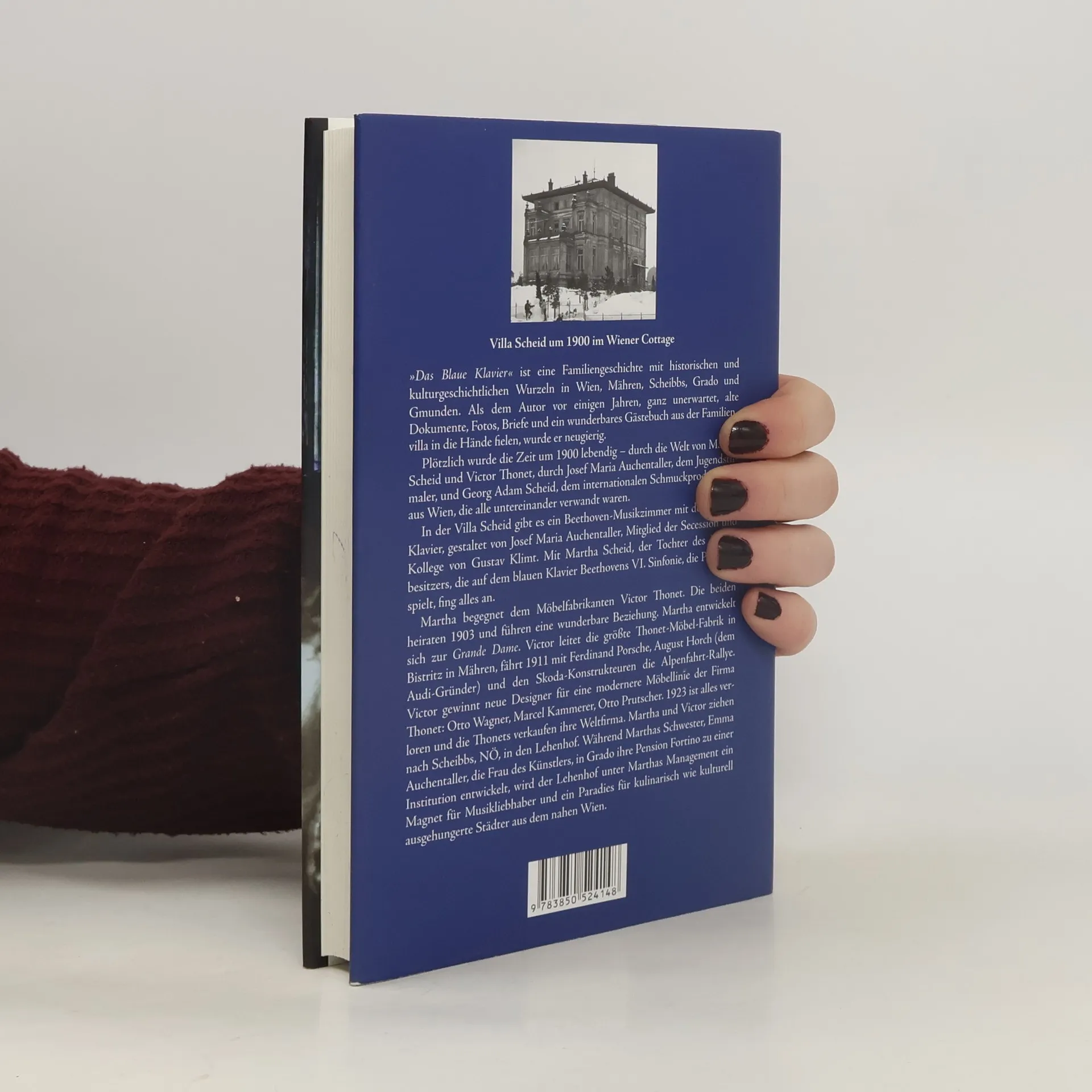 »Das Blaue Klavier« erzählt eine Familiengeschichte mit historischen Wurzeln in Wien, Mähren und anderen Orten. Der Autor entdeckt unerwartet alte Dokumente, Fotos und ein Gästebuch aus der Familienvilla, die ihn in die Zeit um 1900 eintauchen lassen. Die Welt von Martha Scheid, Victor Thonet und anderen Verwandten wird lebendig. In der Villa gibt es ein Beethoven-Musikzimmer mit einem blauen Klavier, gestaltet von Josef Maria Auchentaller, einem Jugendstilmaler und Kollegen von Gustav Klimt. Martha, die Tochter des Villenbesitzers, spielt auf dem Klavier Beethovens VI. Sinfonie und trifft Victor Thonet, einen Möbelfabrikanten. Sie heiraten 1903 und führen eine harmonische Beziehung. Victor leitet die größte Thonet-Möbel-Fabrik in Bistritz und nimmt an der Alpenfahrt-Rallye 1911 teil. Er gewinnt neue Designer für eine modernere Möbellinie. Doch 1923 verlieren die Thonets ihre Firma und ziehen nach Scheibbs, NÖ, in den Lehenhof. Während Marthas Schwester Emma in Grado eine Pension betreibt, wird der Lehenhof unter Marthas Leitung ein Anziehungspunkt für Musikliebhaber und kulinarisch Interessierte aus Wien. Das Buch enthält bisher unveröffentlichte, teils farbige Abbildungen aus dem Victor Thonet und Scheid Archiv.