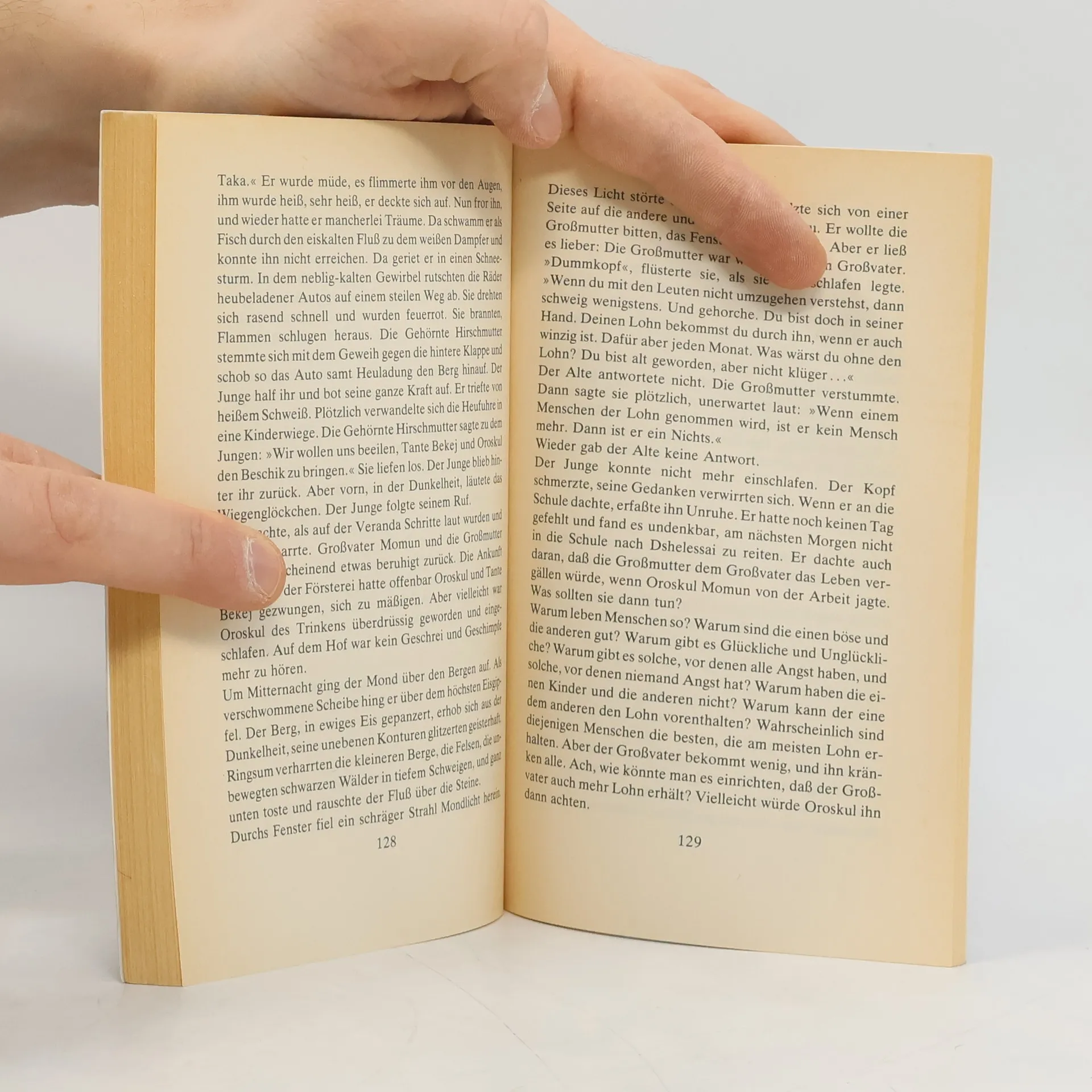 In dem besagten Jahr, von dem Tschingis Aitmatow erzählt, wurde er sieben, es war sein achtes Lebensjahr. Das eine Märchen erlebte der vaterlose Junge mit Hilfe seines Fernglases. Durch das Glas hindurch suchte er in der Ferne den weißen Dampfer: Einer der Matrosen mußte sein Vater sein. Und um zum weißen Dampfer zu gelangen, wollte der Junge sich in einen Fisch verwandeln.