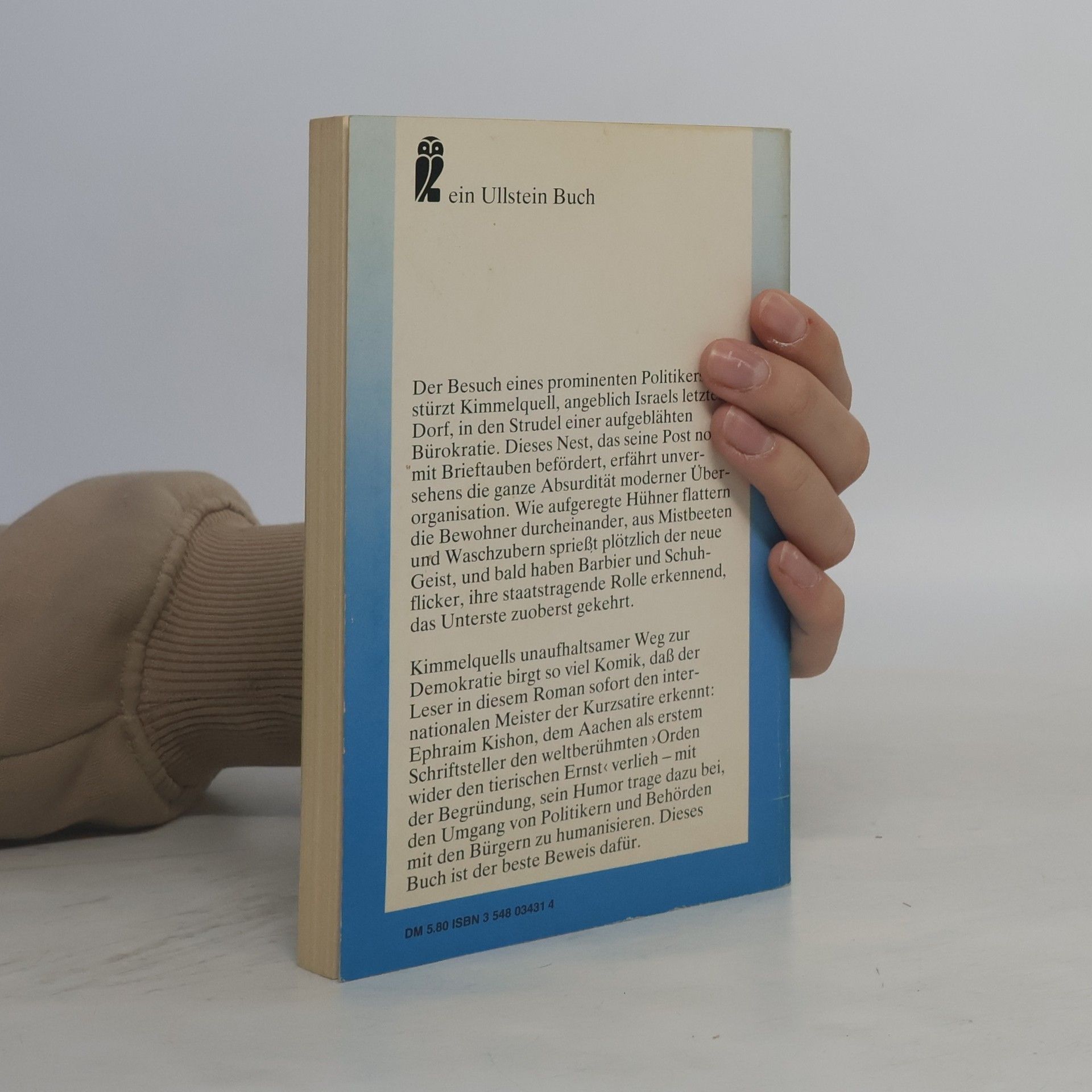 Der Besuch eines prominenten Politikers stürzt Kimmelquell, angeblich Israels letztes Dorf, in den Strudel einer aufgeblähten Bürokratie. Dieses Nest, das seine Post noch mit Brieftauben befördert, erfährt unversehens die ganze Absurdität moderner Überorganisation. Wie aufgeregte Hühner flattern die Bewohner durcheinander, aus Mistbeeten und Waschzubern sprießt plötzlich der neue Geist, und bald haben Barbier und Schuhflicker, ihre staatstragende Rolle erkennend, das Unterste zuoberst gekehrt. Kimmelquells unaufhaltsamer Weg zur Demokratie birgt so viel Komik, daß der Leser in diesem Roman sofort den internationalen Meister der Kurzsatire erkennt: Ephraim Kishon, dem Aachen als erstem Schriftsteller den weltberühmten ›Orden wider den tierischen Ernst‹ verlieh - mit der Begründung, sein Humor trage dazu bei, den Umgang von Politikern und Behörden mit den Bürgern zu humanisieren. Dieses Buch ist der beste Beweis dafür.