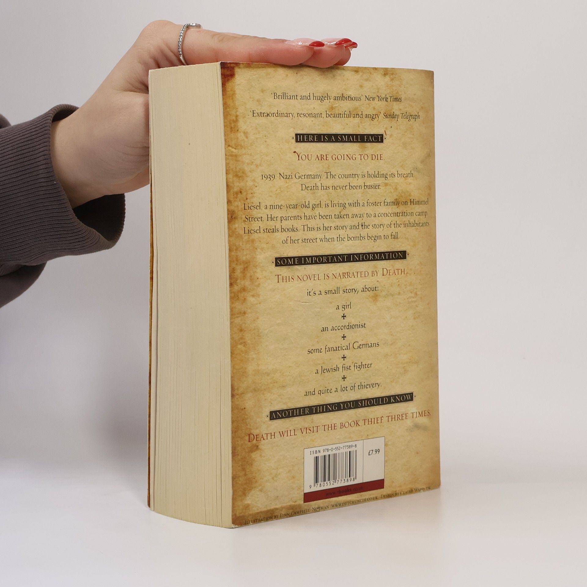 HERE IS A SMALL FACT - YOU ARE GOING TO DIE 1939. Nazi Germany. The country is holding its breath. Death has never been busier. Liesel, a nine-year-old girl, is living with a foster family on Himmel Street. Her parents have been taken away to a concentration camp. Liesel steals books. This is her story and the story of the inhabitants of her street when the bombs begin to fall. SOME IMPORTANT INFORMATION - THIS NOVEL IS NARRATED BY DEATH It's a small story, about: a girl an accordionist some fanatical Germans a Jewish fist fighter and quite a lot of thievery. ANOTHER THING YOU SHOULD KNOW - DEATH WILL VISIT THE BOOK THIEF THREE TIMES