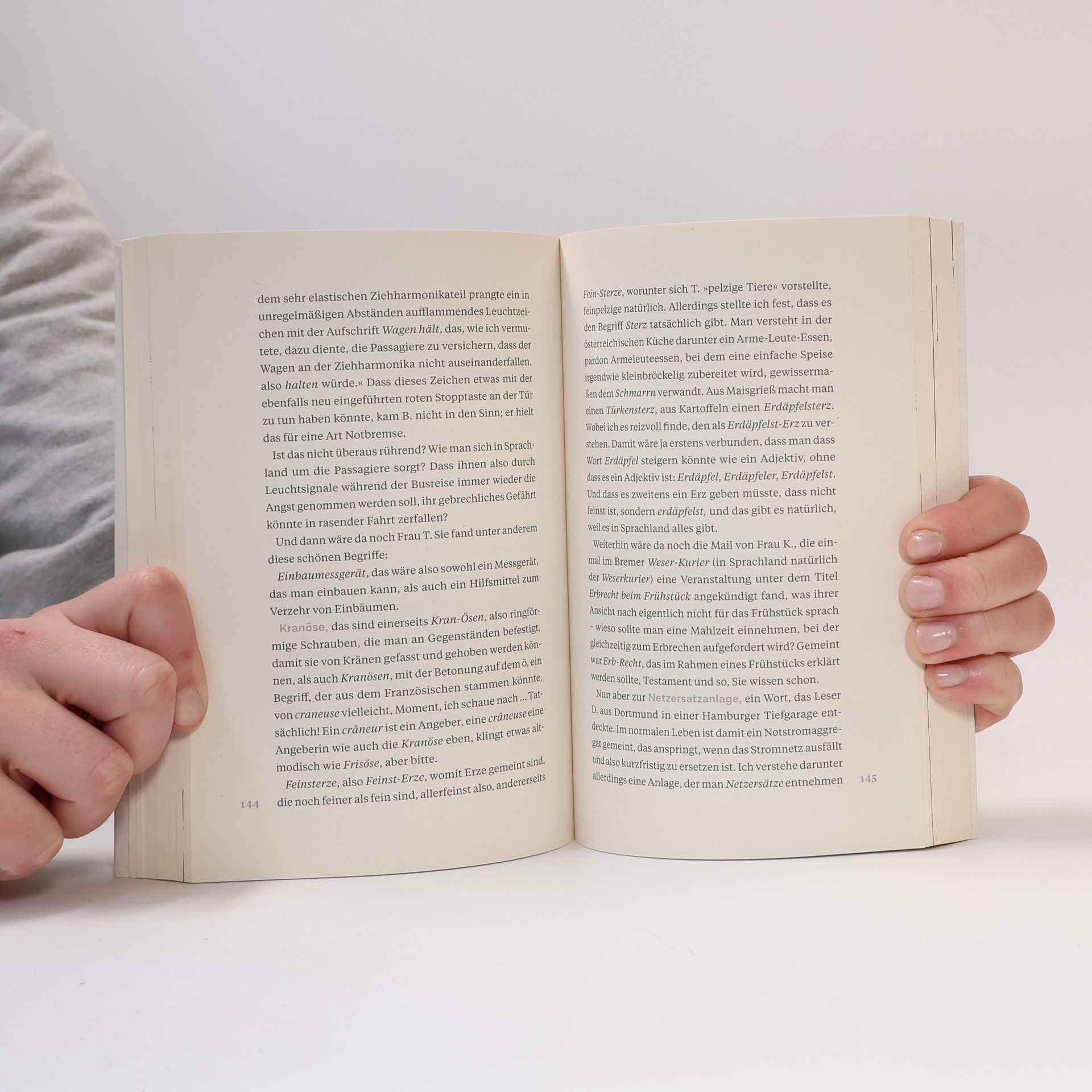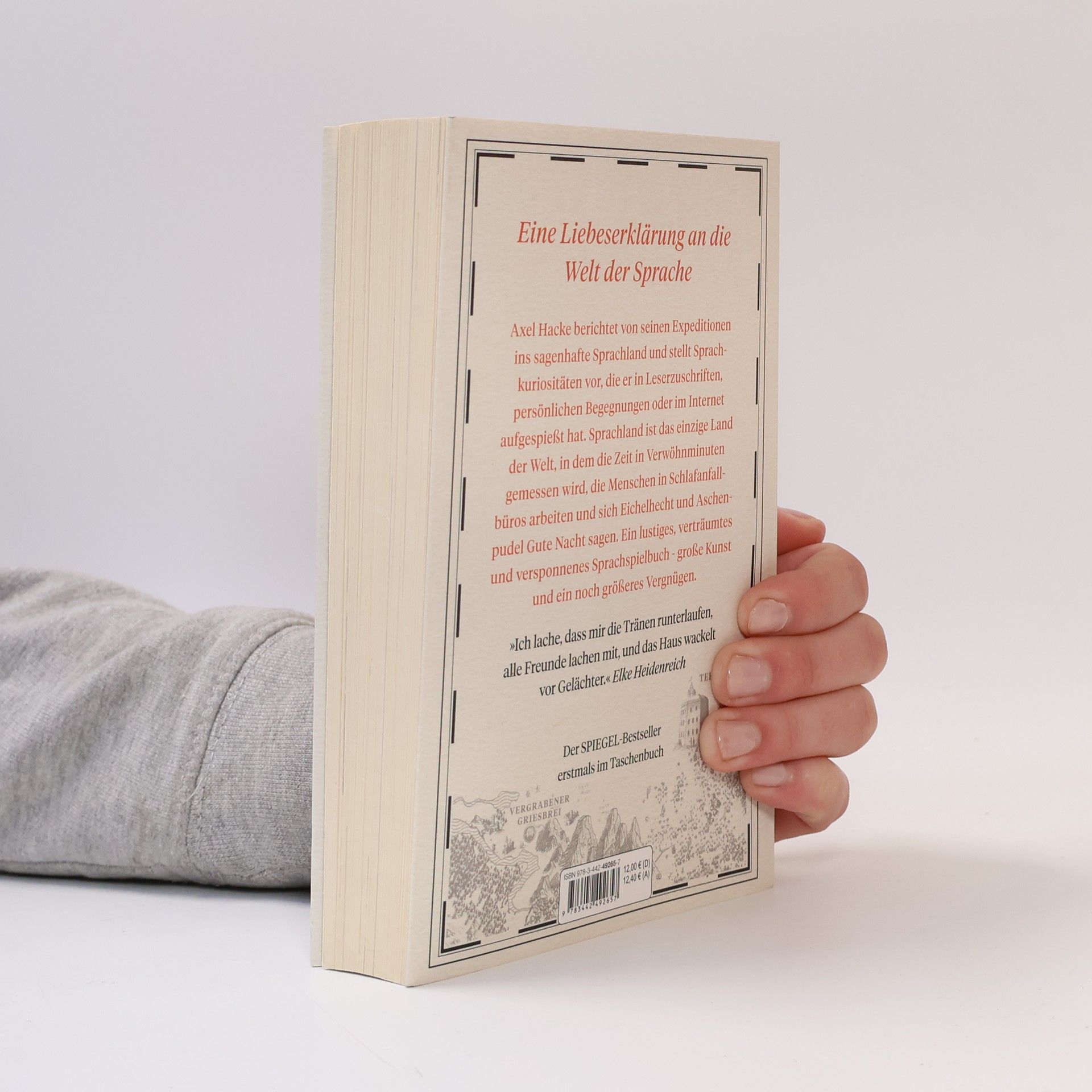 Axel Hacke berichtet von seinen Expeditionen ins sagenhafte Sprachland und stellt Sprachkuriositäten vor, die er in Leserzuschriften, persönlichen Begegnungen oder im Internet aufgespießt hat. Sprachland ist das wohl einzige Land der Welt, in dem die Zeit in Verwöhnminuten gemessen wird, die Menschen in Schlafanfallbüros arbeiten und sich Eichelhecht und Aschenpudel Gute Nacht sagen. In Sprachland sind die Menschen nicht an der schnöden Wirklichkeit regelgerechten Redens und korrekten Schreibens interessiert, sondern am Gegenteil: am Falschen, am Lächerlichen, am Hoch- und Tieftrabenden, am Irritiertsein, dem kurzen Stutzen, an der Poesie und dem Nachdenken. Ein geistreicher und witziger Lesegenuss, bei dem der Lachmuskelkater garantiert ist.