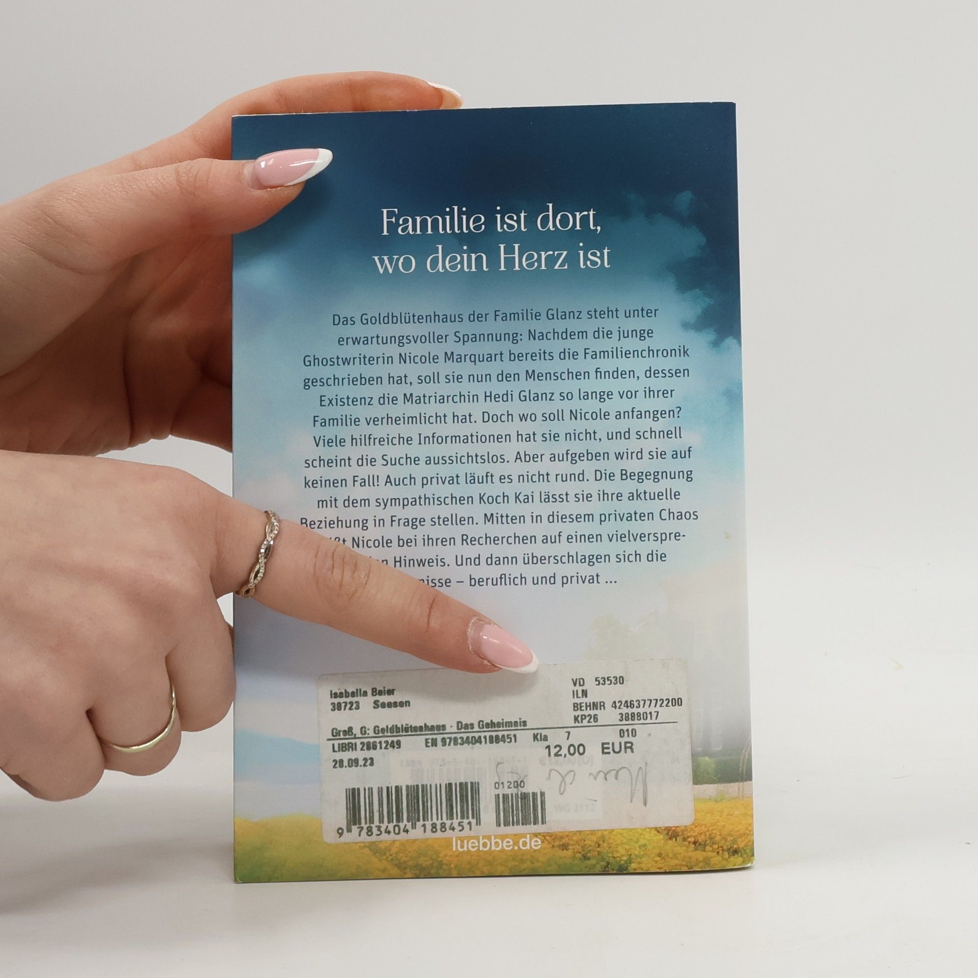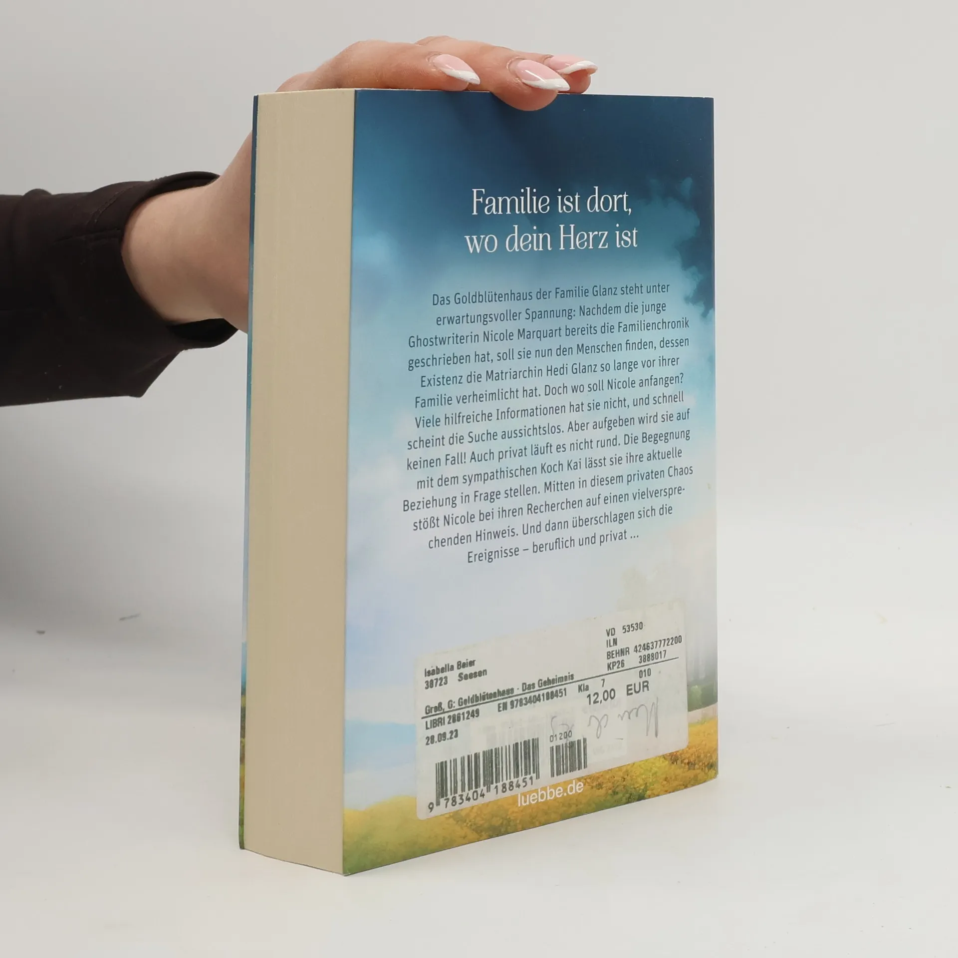 Familie ist dort, wo dein Herz ist Das Goldblütenhaus der Familie Glanz steht unter erwartungsvoller Spannung: Nachdem die junge Ghostwriterin Nicole Marquart bereits die Familienchronik geschrieben hat, soll sie nun den Menschen finden, dessen Existenz die Matriarchin Hedi Glanz so lange vor ihrer Familie verheimlicht hat. Doch wo soll Nicole anfangen? Viele hilfreiche Informationen hat sie nicht, und schnell scheint die Suche aussichtslos. Aber aufgeben wird sie auf keinen Fall! Auch privat läuft es nicht rund. Die Begegnung mit dem sympathischen Koch Kai lässt sie ihre aktuelle Beziehung in Frage stellen. Mitten in diesem privaten Chaos stößt Nicole bei ihren Recherchen auf einen vielversprechenden Hinweis. Und dann überschlagen sich die Ereignisse - beruflich und privat ... Begleiten Sie die Familie Glanz durch ihre bewegte Geschichte - Band 3 der Goldblütenhaus-Saga