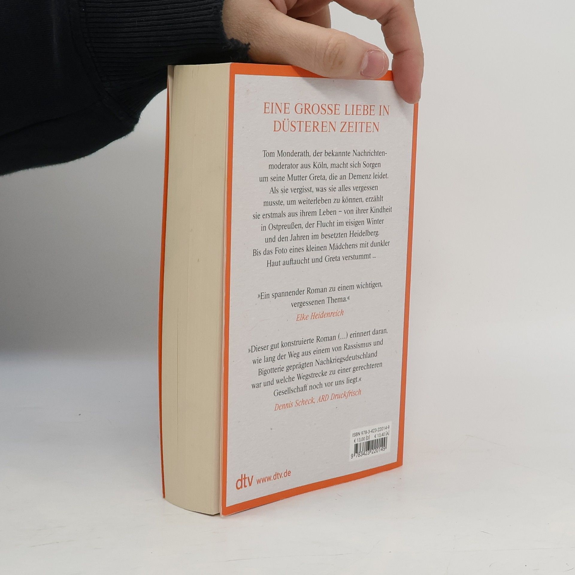 Eine große Liebe in düsteren Zeiten ist ein bemerkenswertes Debüt und ein generationsübergreifender Familienroman. Der Kölner Nachrichtenmoderator Tom Monderath ist besorgt um seine 84-jährige Mutter Greta, die zunehmend vergesslich wird. Als die Diagnose Demenz im Raum steht, ist Tom erschüttert. Doch die Krankheit wird zu einem Geschenk, als Greta beginnt, von ihrem Leben zu erzählen – von ihrer Kindheit in Ostpreußen, ihren geliebten Großeltern, der Flucht vor den russischen Soldaten im Winter und ihrer Zeit im besetzten Heidelberg. Als Tom jedoch ein Foto eines kleinen Mädchens mit dunkler Haut entdeckt, verstummt Greta. Dies führt Tom dazu, sich intensiver mit der Vergangenheit seiner Mutter auseinanderzusetzen, um ihre Traurigkeit zu verstehen und sein eigenes Glück zu finden. Nichts bleibt für immer vergessen – die Autorin schreibt hochemotional, klug und einfühlsam. Der Roman thematisiert wichtige, oft vergessene Aspekte der Geschichte und reflektiert über den langen Weg aus einem von Rassismus und Bigotterie geprägten Nachkriegsdeutschland.
