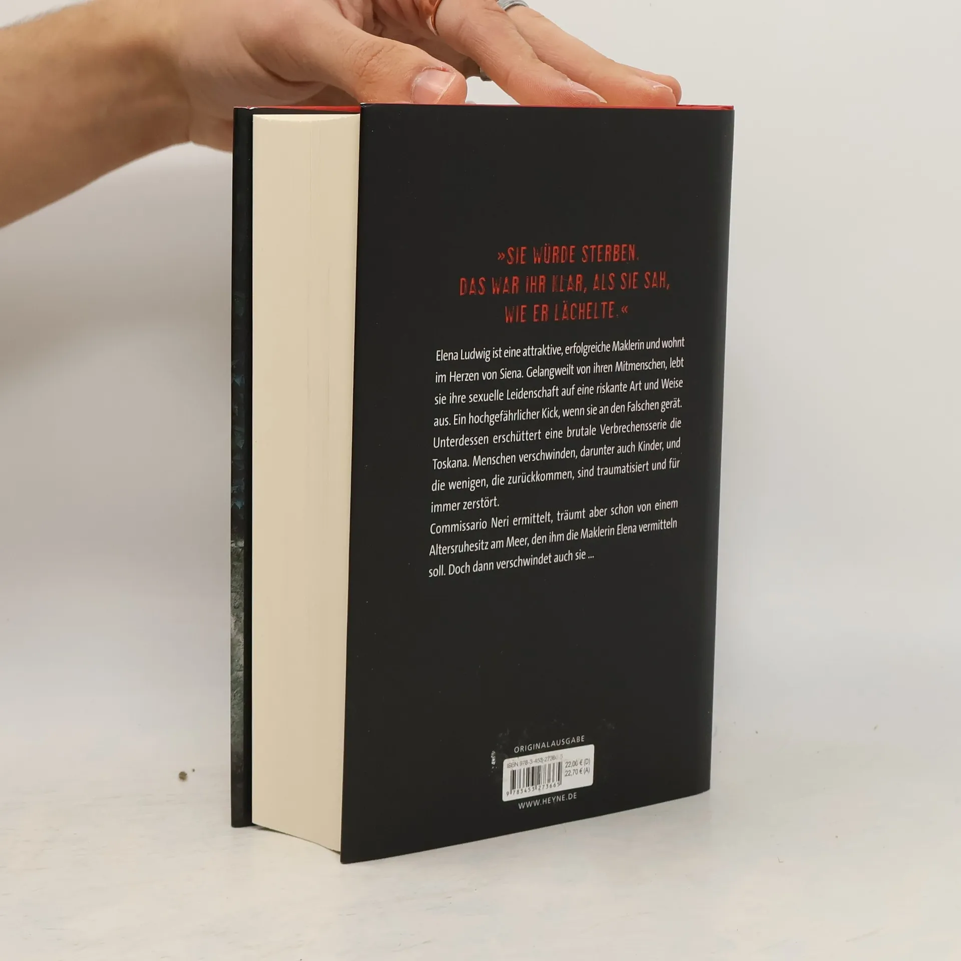Elena Ludwig ist eine attraktive, gut situierte Maklerin und wohnt im Herzen von Siena. Gelangweilt von ihren Mitmenschen, lebt sie ihre sexuelle Leidenschaft auf eine riskante Art und Weise aus. Ein hochgefährlicher Kick, wenn sie an den Falschen gerät. Unterdessen erschüttert eine brutale Verbrechensserie die Toskana. Menschen verschwinden, und die wenigen, die zurückkommen, sind traumatisiert und für immer zerstört. Commissario Neri ermittelt, träumt aber schon von einem Altersruhesitz am Meer, den ihm die Maklerin Elena vermitteln soll. Doch dann verschwindet auch sie...